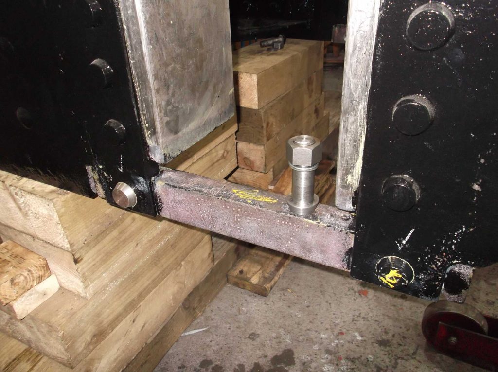 The bogie horn stays are being fitted with new fitted bolts. This requires the frames and horn stays to be reamed through—not easy as there is only one bolt at each end of the horn stay, so it must be clamped to ensure no movement during the reaming operation. Once one end is reamed it is accurately measured and a bolt machined to suit. By the end of the week all the horn stays had received a new fitted bolt at one end. When fitted, the other end is accurately located and reamed. Reaming of these ends is nearly complete. The reaming is done with the mag-drill fixed to a plate arrangement designed and fabricated by the volunteer Engineering Team.