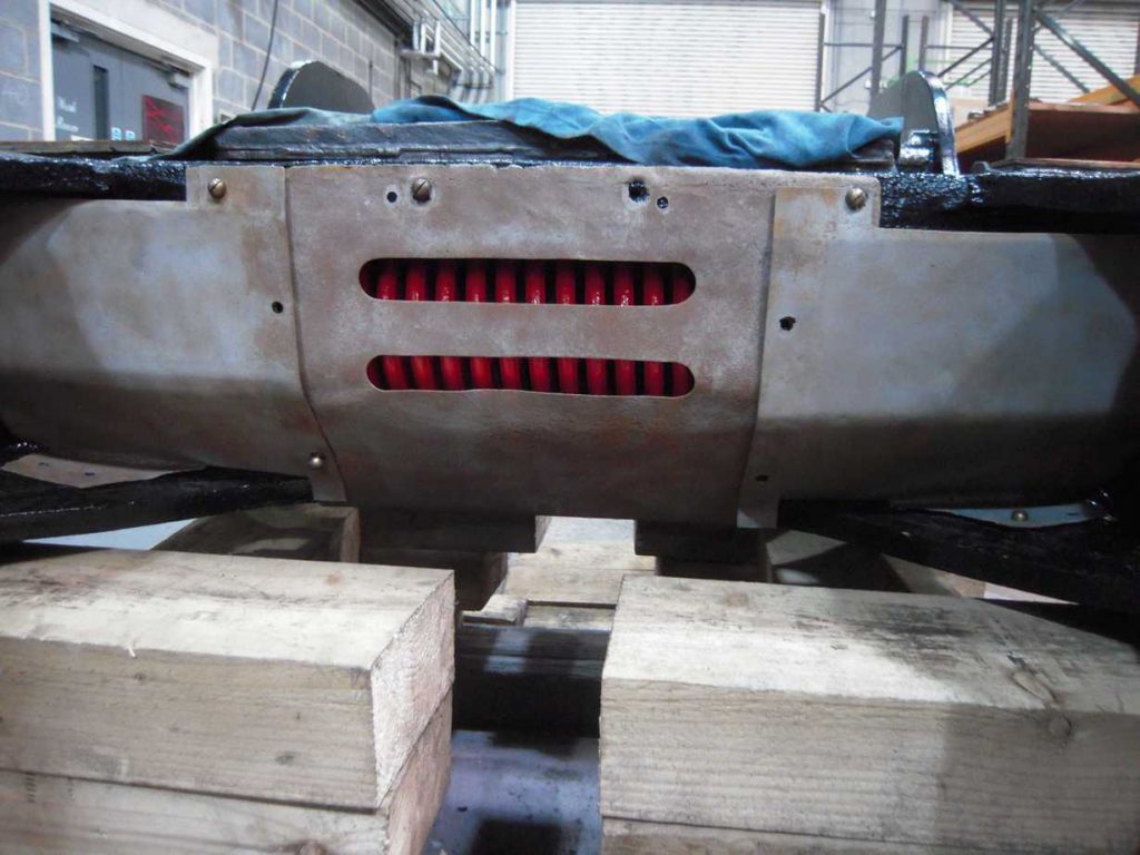 The bogie cladding plates have now been repaired. They have been brazed to fill the pin holing and the cracks have been gas welded. Some panel beating and dressing of damaged edges was also required. After wire brushing they have now been prime painted.