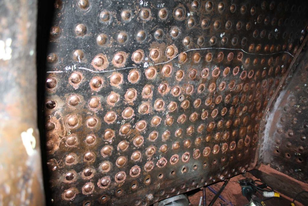 Further work is required to the rear of the diaphragm plate stretcher and the 007 Gang of junior volunteers shared the work on Saturday using the needle gun, getting where the larger Engineering Team volunteers would find access challenging.