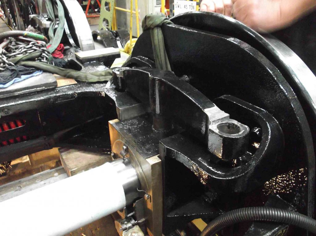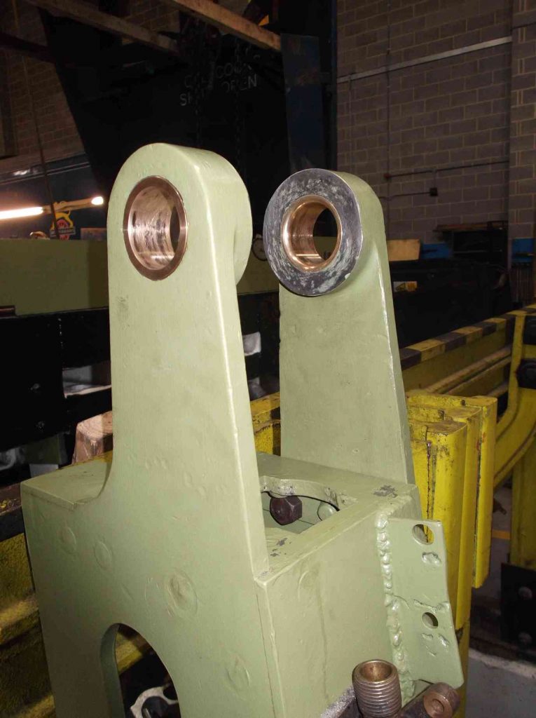 The inspection of the expansion link trunnion bearing housings has shown that there have been historical repairs to the locomotive. At some time the housings, part of the brackets on the loco, have been re-bored and lined. Unfortunately they have not been bored on the original centre line, resulting in an offset liner in the bracket hole. We can only imagine that at some time the bearings have seized and damaged the housings requiring them to be repaired in this way.