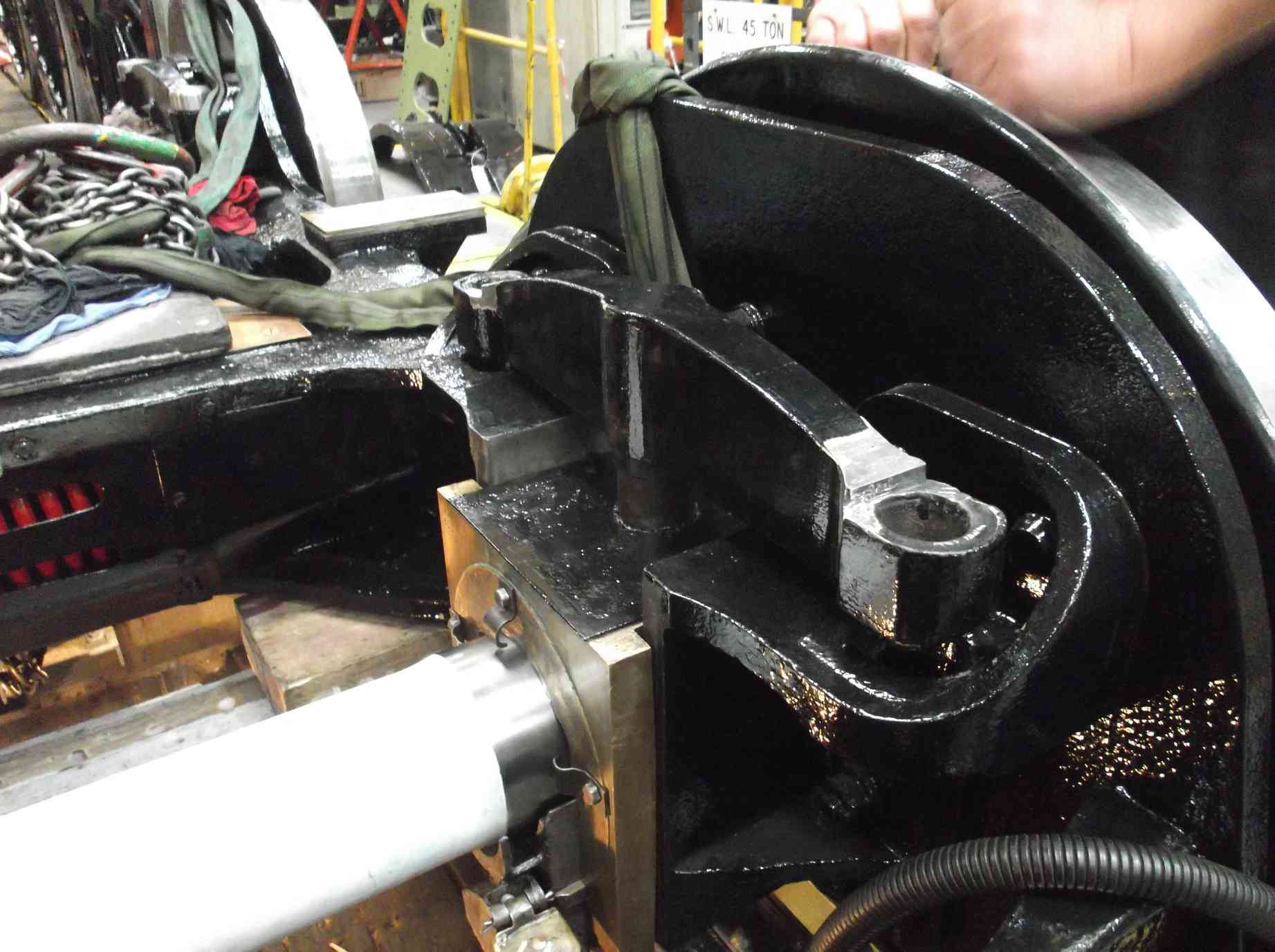With the tank secured, we then moved onto lifting the tender frames to release the axleboxes, and also to allow the tender wheels to be rotated sufficiently to allow access to all areas of the inside of the frames and outer surfaces of the wheels. We used the same lifting technique as used on the tank, but access to the bottom of the frames for jacking and packing is not as good as the flat bottom of the tank. Eventually the frames were lifted sufficiently and left on the packing until they can be lowered back on to the axleboxes.