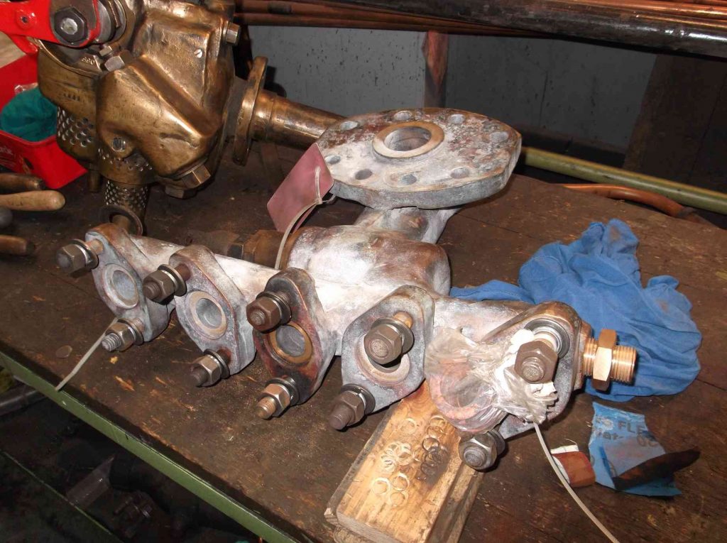 The steam heat valve from the boiler manifold has been returned from contractor repair. This valve required a new body, cast in bronze. As many parts of the old valve as possible have been used. The sealing copper rings for the valves mounted on the manifold have been annealed and the end fitting, also new and made from bronze is being fitted. The clackboxes have now been delivered to Llangollen.
