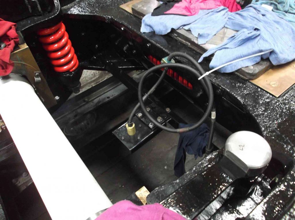 The AWS brackets on the front of the bogie are mounted on anti-vibration rubber bushes. Rail spare part stockists have been contacted for replacements and even though the same arrangement is fitted to some diesel locomotives, they say there are no spares available. So, new bushes are being manufactured by the rubber manufacturer we have used for some other parts on the locomotive. The TPWS bracket and aerial and the AWS receiver and carrier have now been fitted and new grease nipples fitted to the side bearers.