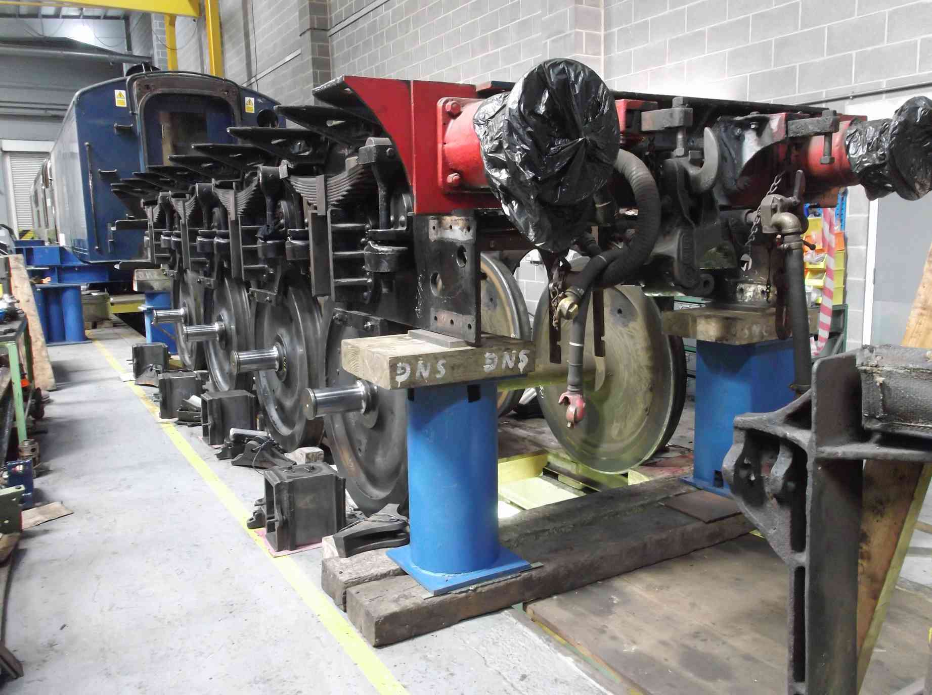 With the tender tank lifted, the vacuum cylinders and their brackets were removed. These will now be evaluated and overhauled. The work on the tender frames has also progressed with the removal and dismantling of the axleboxes.