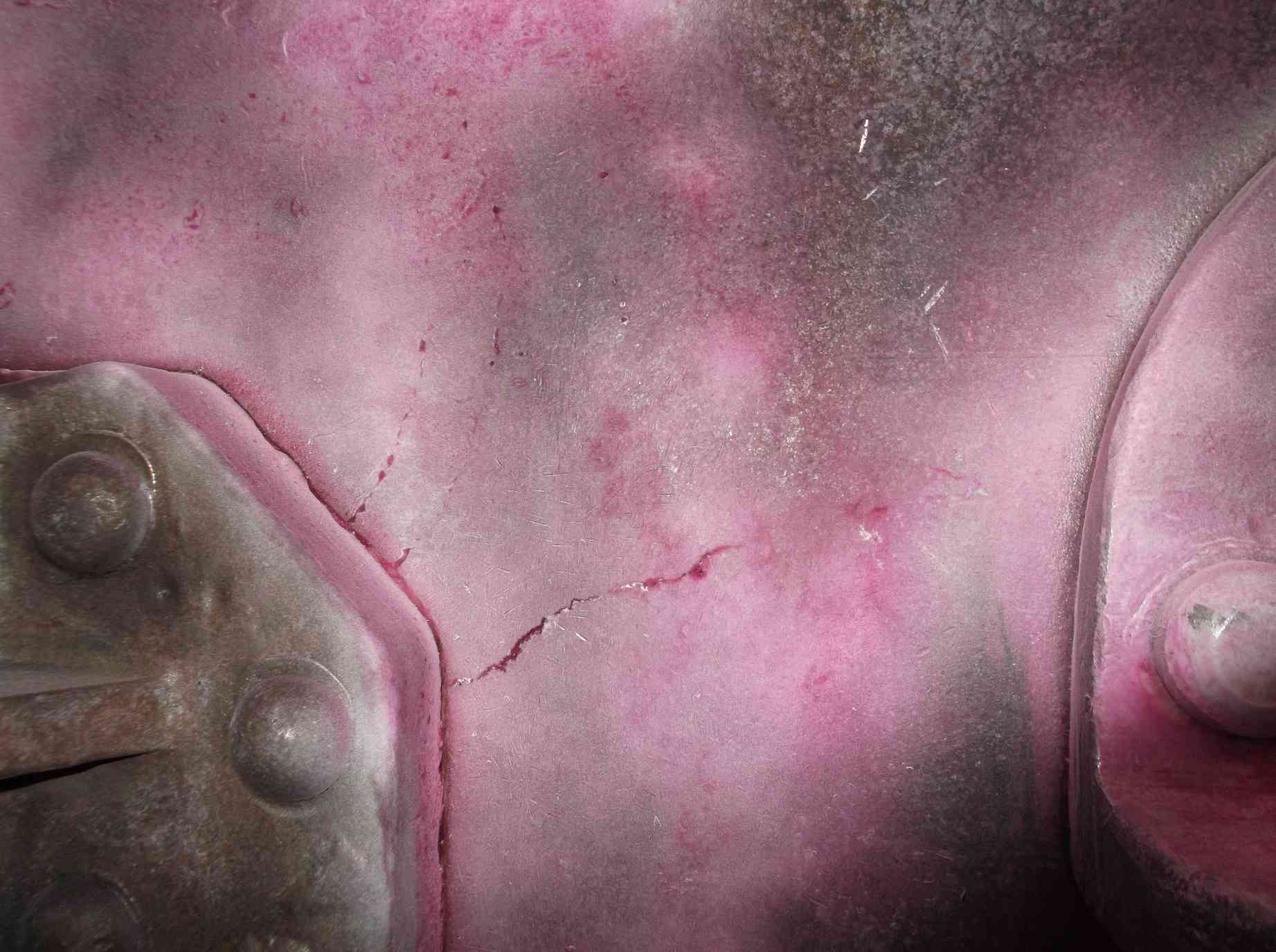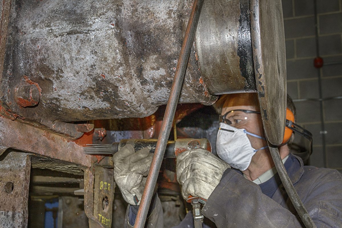 Needle-gunning is continuing on the trailing tender dragbox. The leading and trailing dragboxes have also been measured to assess the degree of wastage these castings have seen. The trailing dragbox measures in excess of the original drawing specified thicknesses in many places and apart from surface corrosion does not seem to have lost any significant material. The leading dragbox has seen wastage, the dimensions have been recorded, and will be considered.