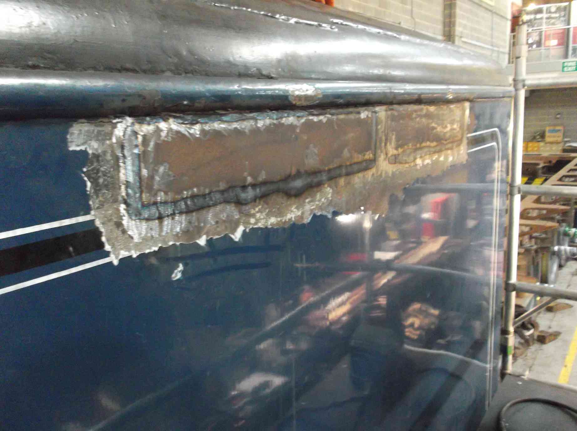 There are larger cutouts to be put in for the drawgear pins and water valve rods, but we didn’t have access to the burning gear this week. However, good progress has been made. The area inside and out where the old bottom plate will have to be removed has seen further preparation by the removal of scale, paint and filler.