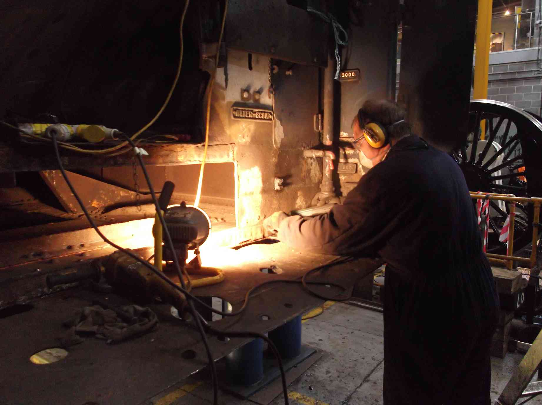 More work has been done on the front of the tender with the removal of the rivets holding the bottom plate on to the original 1928 side angles. We also had a visit from a steel supplier to measure up, as they have been asked to quote for the supply of new plate. Our normal suppliers are on Teesside, but for large pieces of plate we would incur delivery charges.