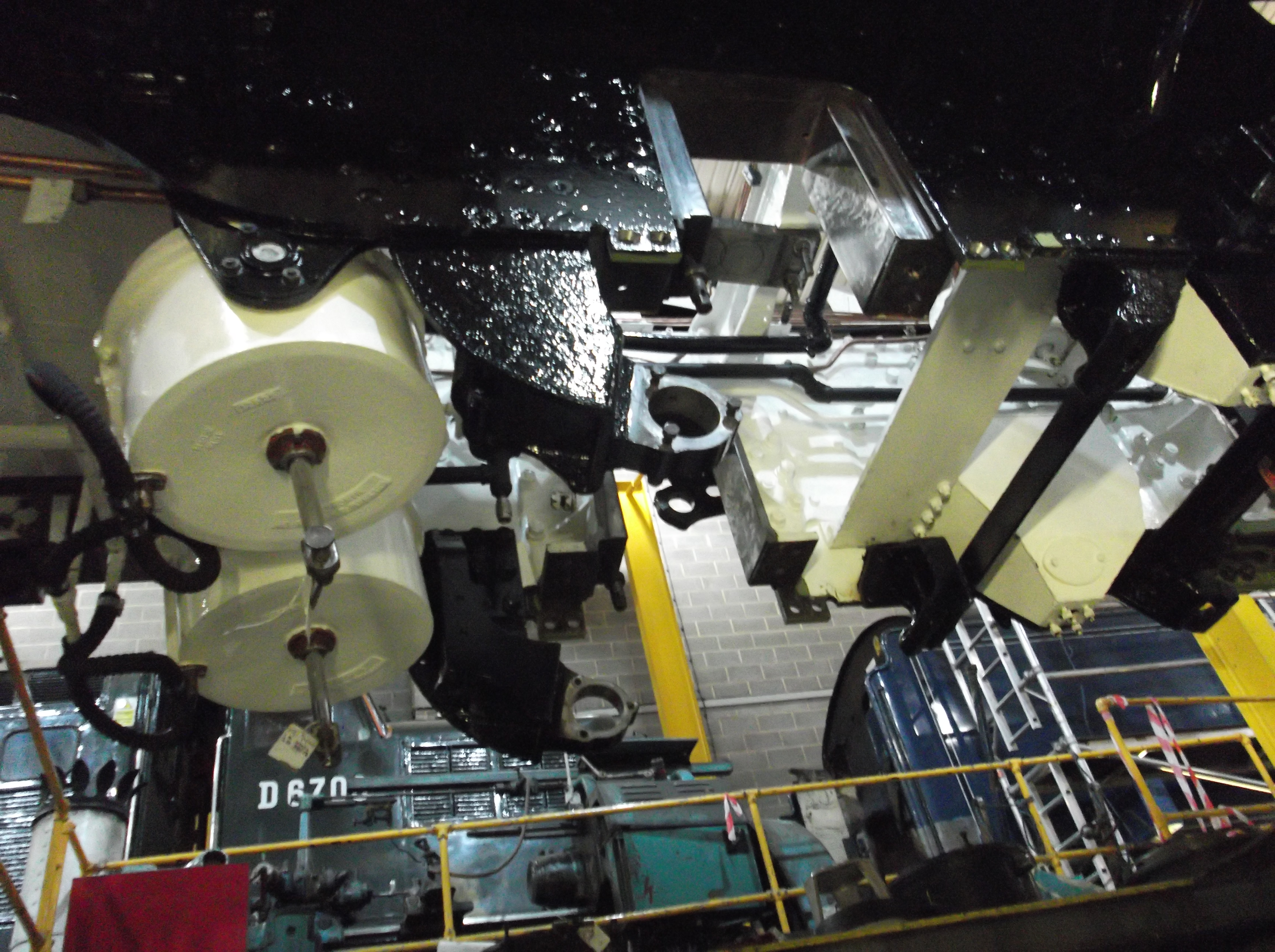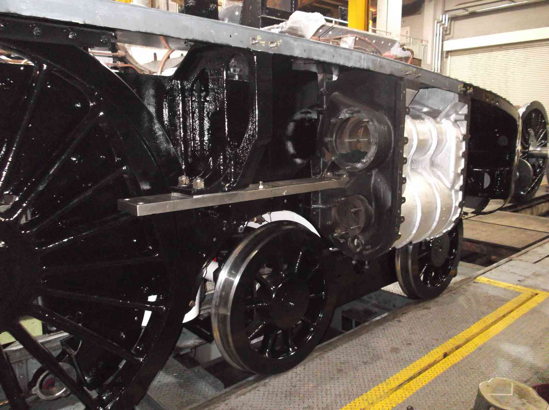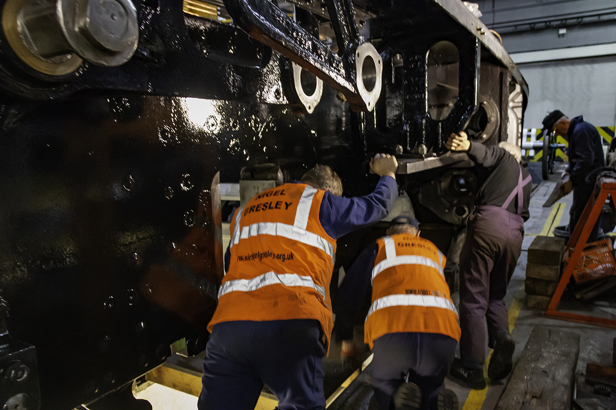 With the axleboxes in position the hornstays, which are remarkably large and heavy once they have to be manually lifted and held in place, were drawn up on to the hornblocks by lengths of studding. The studding was made up for this job and will form a kit for doing this job in future. With the hornstays nearly up they were drawn in to their final position by horizontal and vertical bolting. Once started, with the hornstays off the frames, the job has to be finished, so thanks to the team who stayed back until completion.