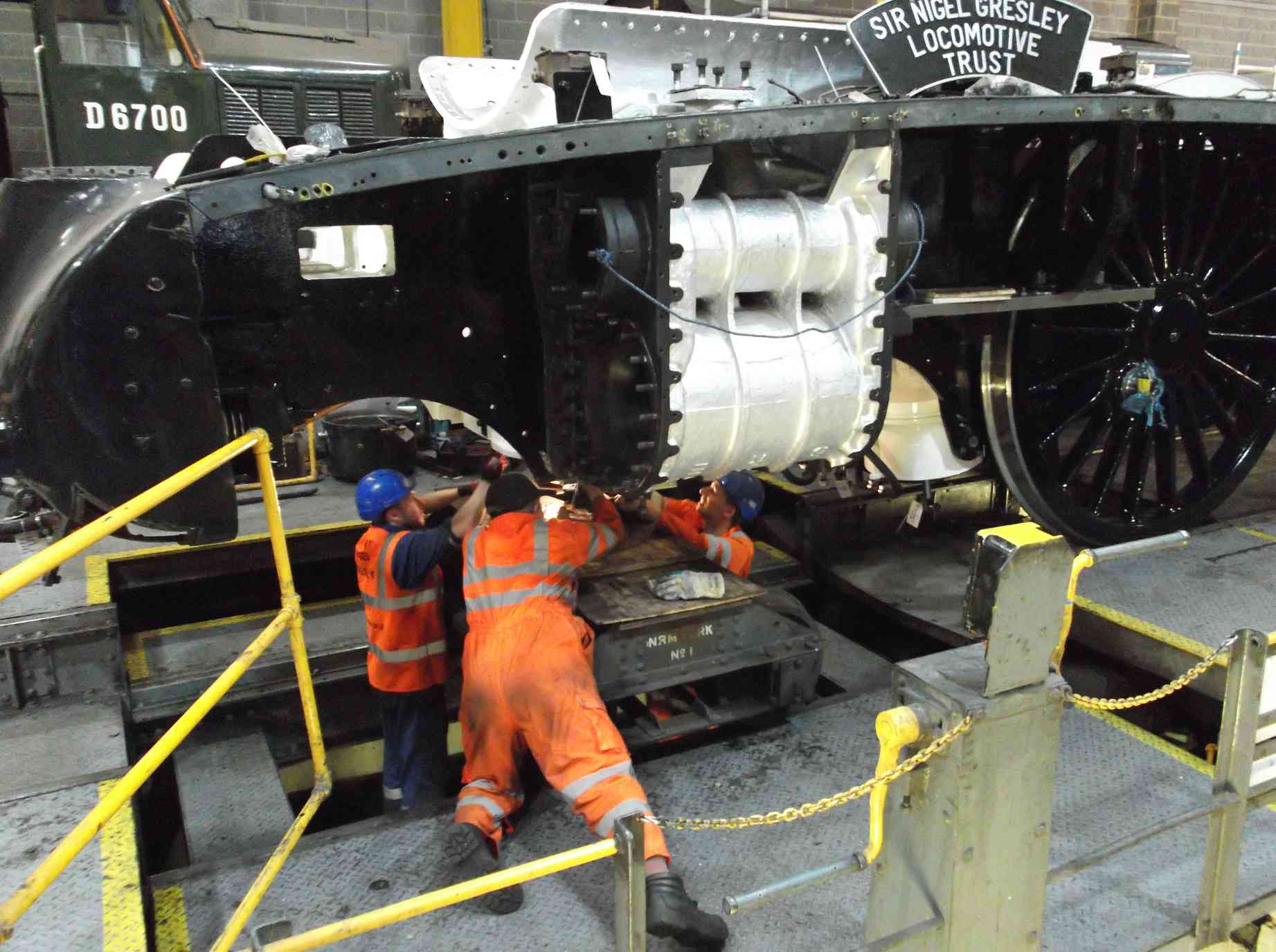 The leading wheelset was fitted on the NRM workshop wheeldrop. The loco was pinched forward so that the accommodation bogie was positioned on the far side of the wheeldrop. Prior to moving the loco the leading wheelset and bogie were placed on the south road in the workshop, being lifted there on the wheeldrop crane, the spectacle being appreciated by the public on the viewing gallery.