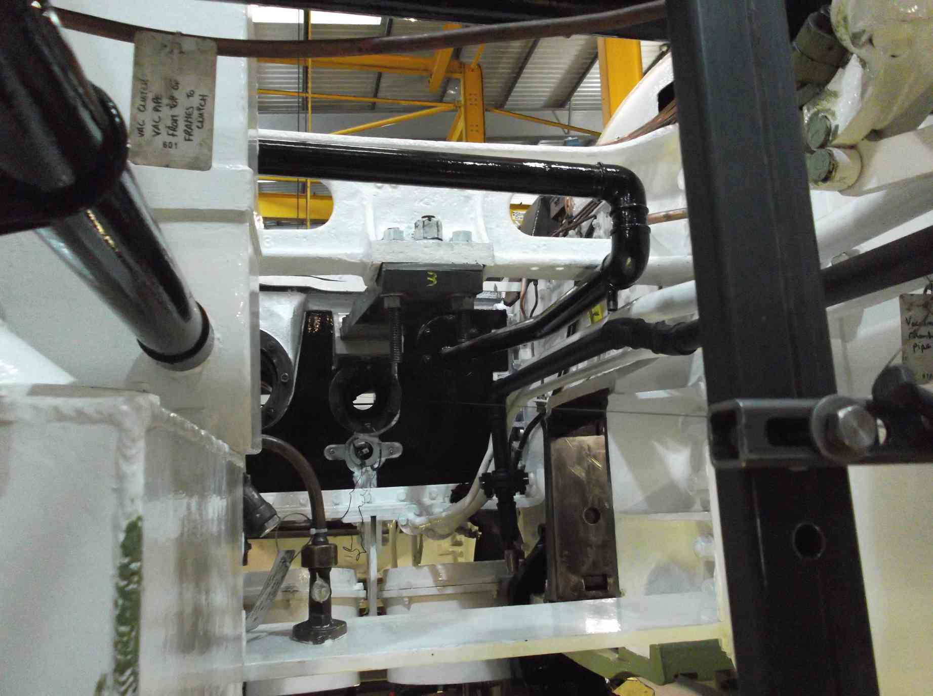 This time the bogie was lifted off the south road with the crane and lowered in to the pit. This was a close fit and had to be pushed with timber lengths to clear a modern cable tray on the wall of the pit. At the bottom of the pit, ropes securing the rubbing plates on the top centre of the bogie were removed. The bogie was then lifted under the loco. There’s a lot more to watch with the bogie going up so with people all round we slowly brought the bogie up. It was clear we would be close to the vacuum cylinder flexible pipes. This was expected as it was the case with the last installation. When close to fully up the pipe routing was discussed by our CME and pipe ftting team leader and they decided it could be improved, so the pipes were removed.