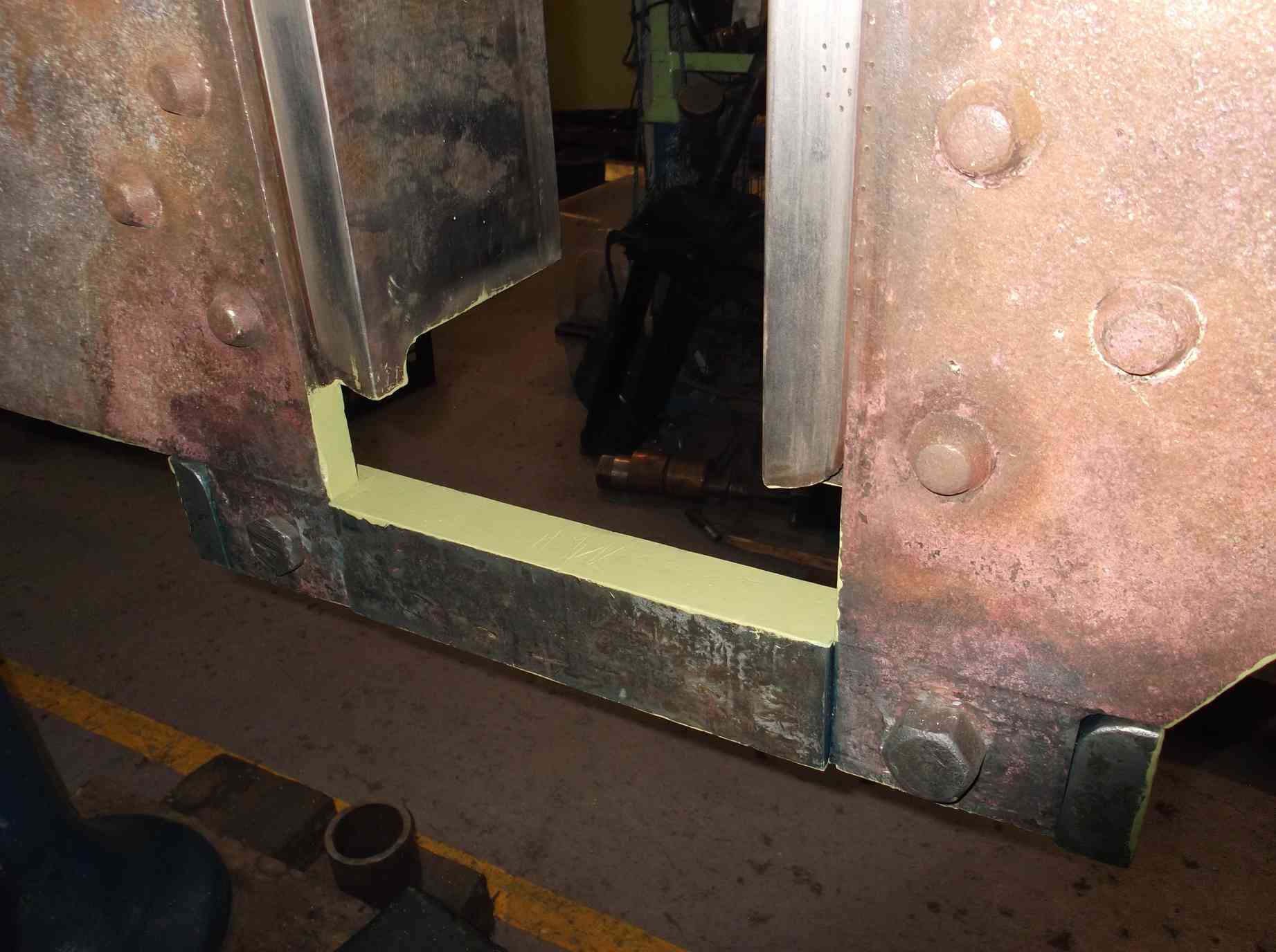 Welding also continues on the front inside of the right hand frames to restore the plate thickness. This job progresses between the platework jobs our welder is helping out with around the tender tank.