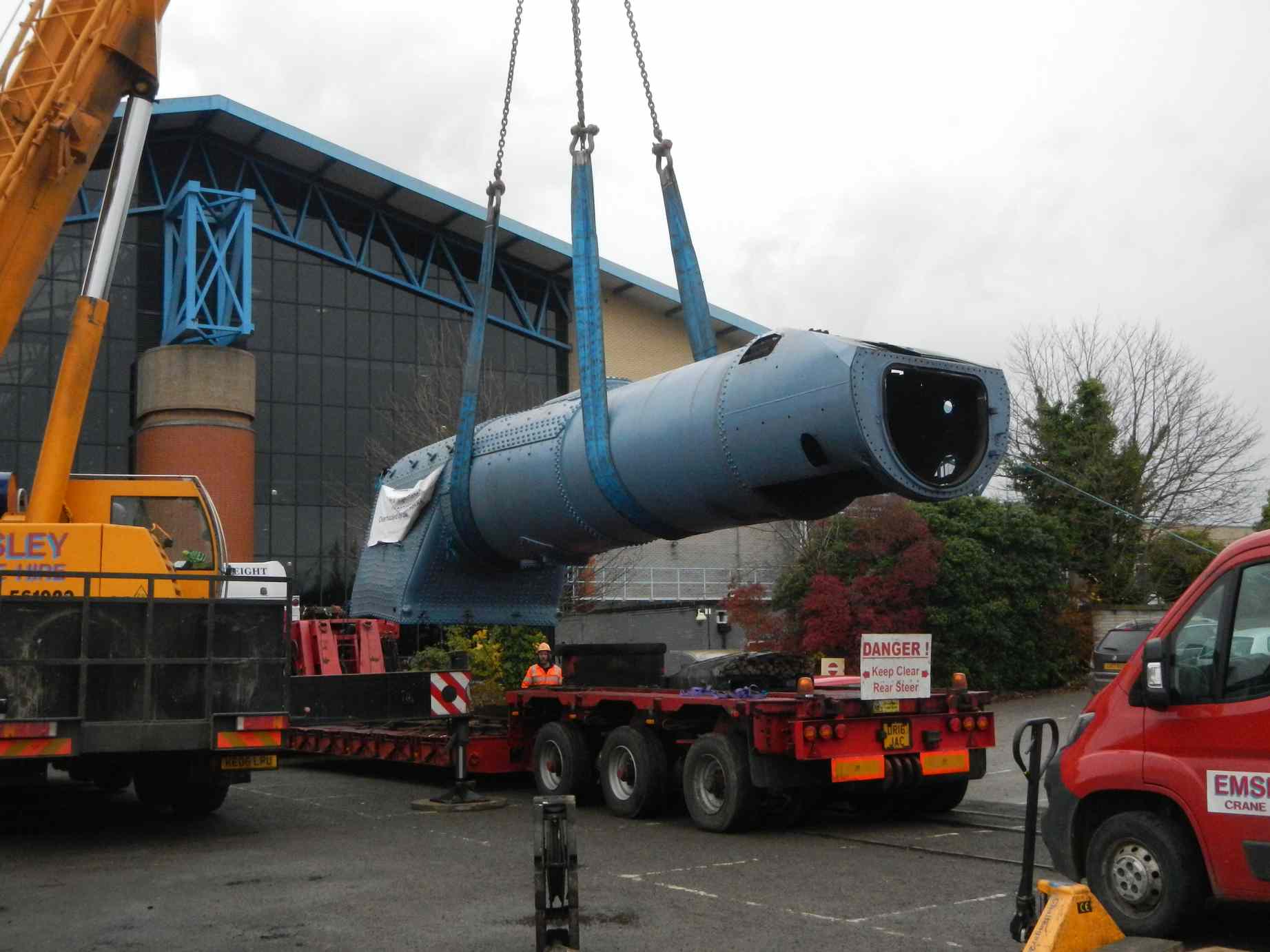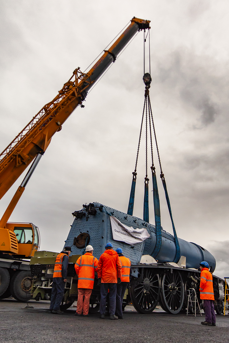 Next day with the boiler on its road transport, having arrived the night before, we were shunted by the same NRM team in to the car park, followed by an attentive Engineering Team. The crane arrived on time and was positioned between the boiler and frames. Before lifting the plugs and mud hole doors that need to be removed before a fitting attempt could be made were taken out. Then the boiler was lifted and after adjusting the slings we had a level lift. The boiler was then swung over the frames and very gently lowered.