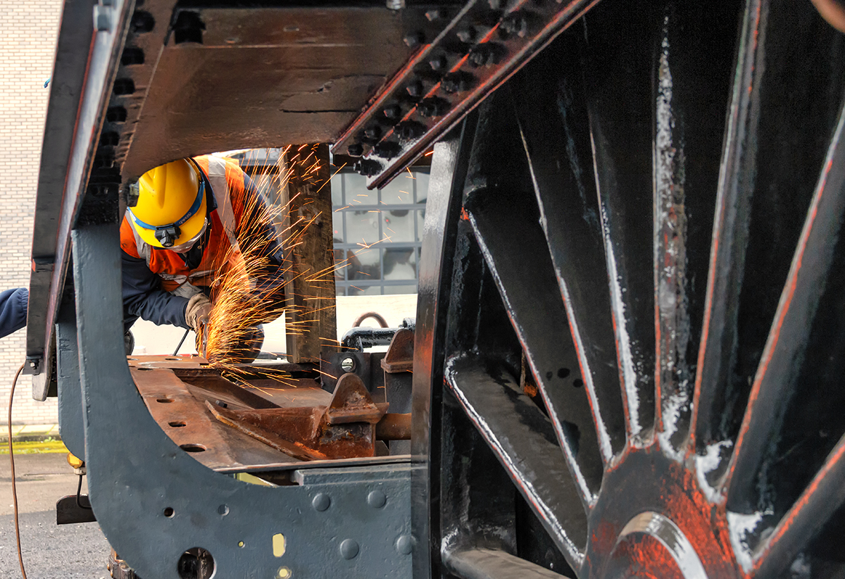Meanwhile, work continues on the replacement of the platework around the front of the tender. New steelwork is now installed along the tops of the handbrake level shelves, and on the front below the shelf on the scoop handle side. Work continues on the matching steelwork on the handbrake side. It’s quite a complicated structure and has been time consuming as we are replacing like for like to keep it as authentic as possible.