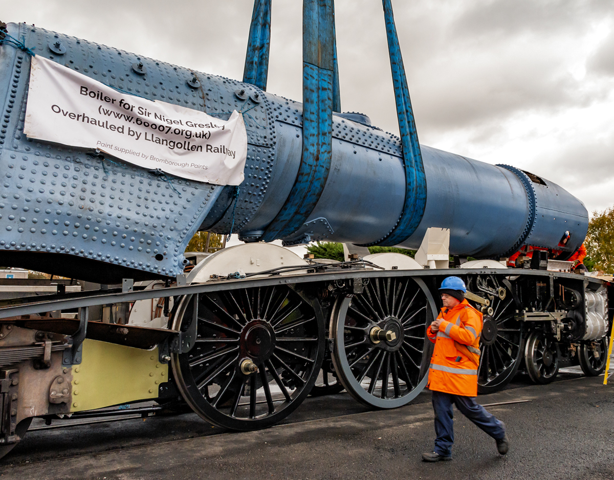 With a satisfactory fit on the boiler all round, the smokebox to saddle was sealed using a special high temperature sealant donated by Everbuild of Leeds. An Engineering Team member negotiating the donation and then collecting it. With the weather threatening rain, the boiler was lowered again and the first bolts were put in around the saddle flange.