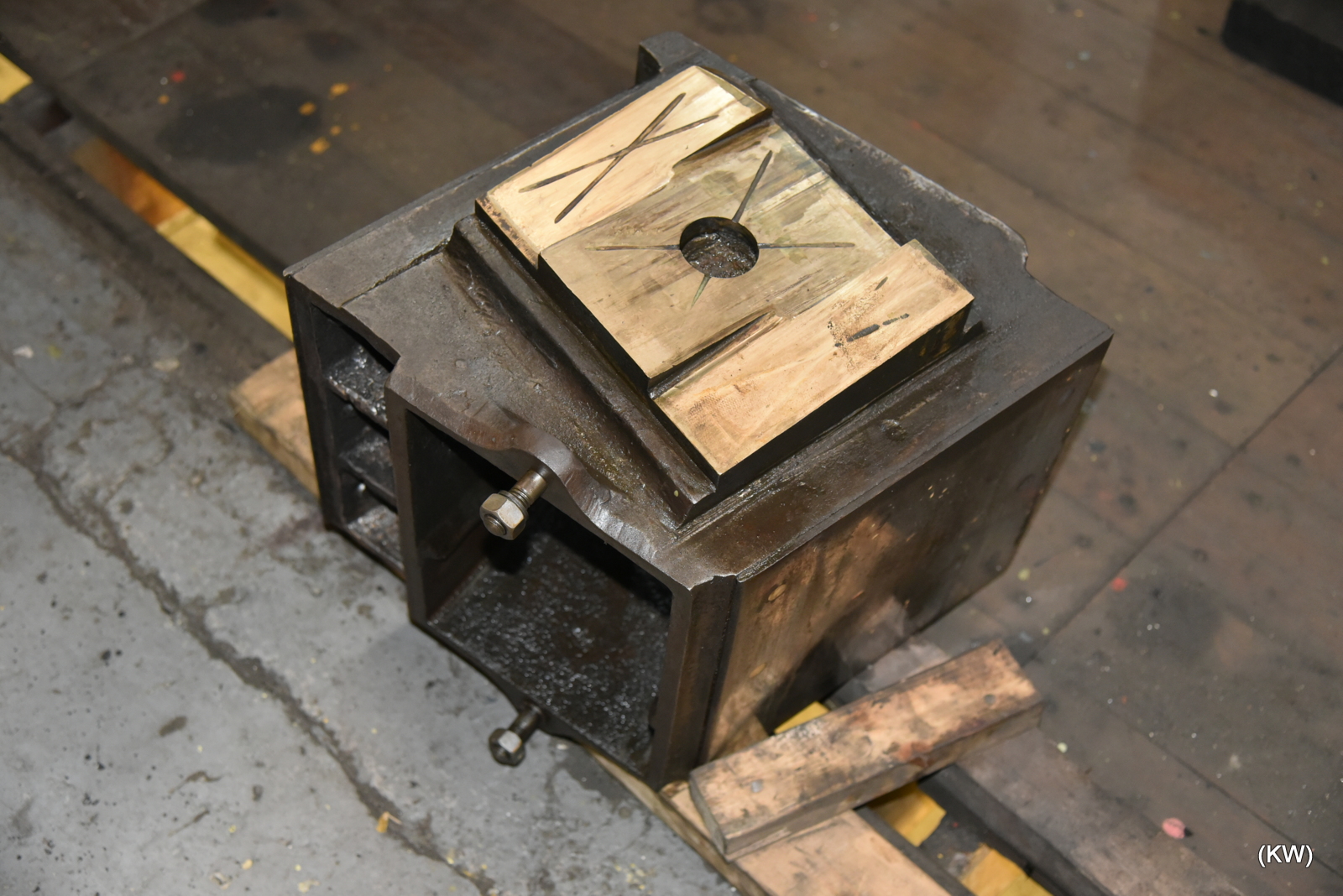 The boiler washout plugs and doors have been stamped up with new identifying letters and numbers so these have now been noted on our drawing for future reference. Where the boiler has come to rest on the frames it is hard up on one of the crinoline brackets at the firebox end so it was cut off and will be welded back on when we fit the crinoline.