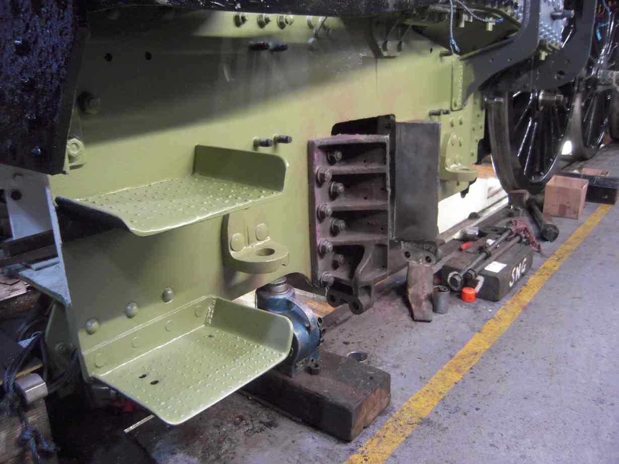 The Cartazzi frames have also seen work. The frames have been needle gunned. This has allowed them to be examined and tested. No faults have been found and all the unloaded rivets in the spring hanger brackets are tight. The outer Cartazzi frames are now painted to undercoat.