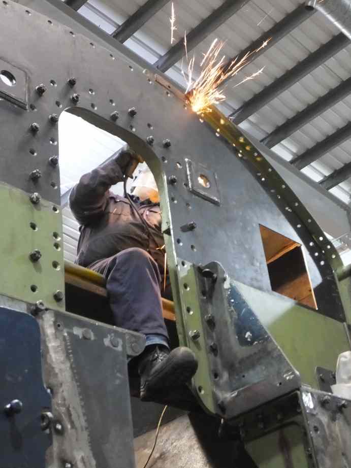 Work continues on the tender. The new upper plate for the tender front has been countersunk and fitted in the tender. The reinforcing lifting squares have been welded in place.