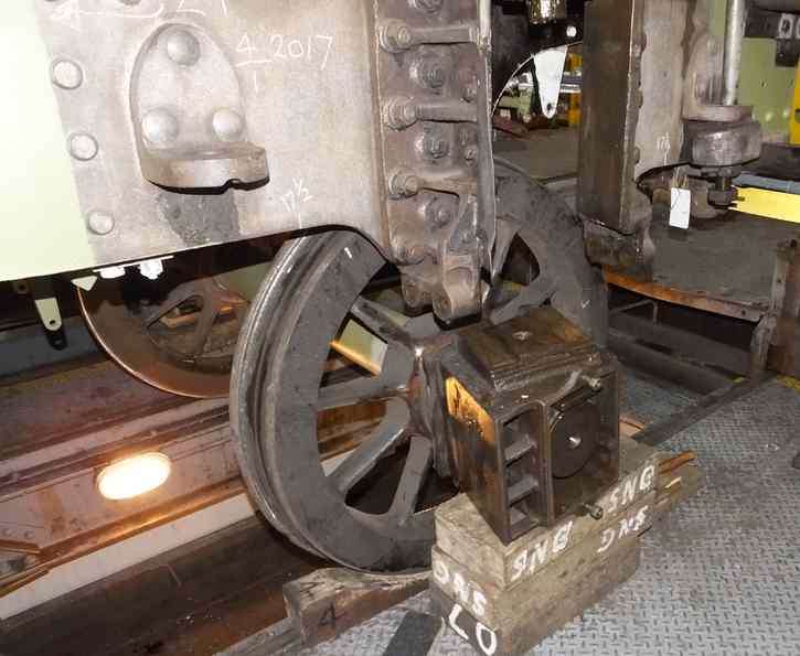 The wheelset was lowered just enough to get the top plates off then lowered to the bottom of the pit where the axleboxes were removed and lifted out. The wheelset and its components are now being examined. The left outer hornstay shows markings suggesting that in its history it had been fitted to locos 2548 (Galtee More), 2572 (St. Gatien) and R-LNE-2565 (Merry Hampton), the latter looking like the first stamping.