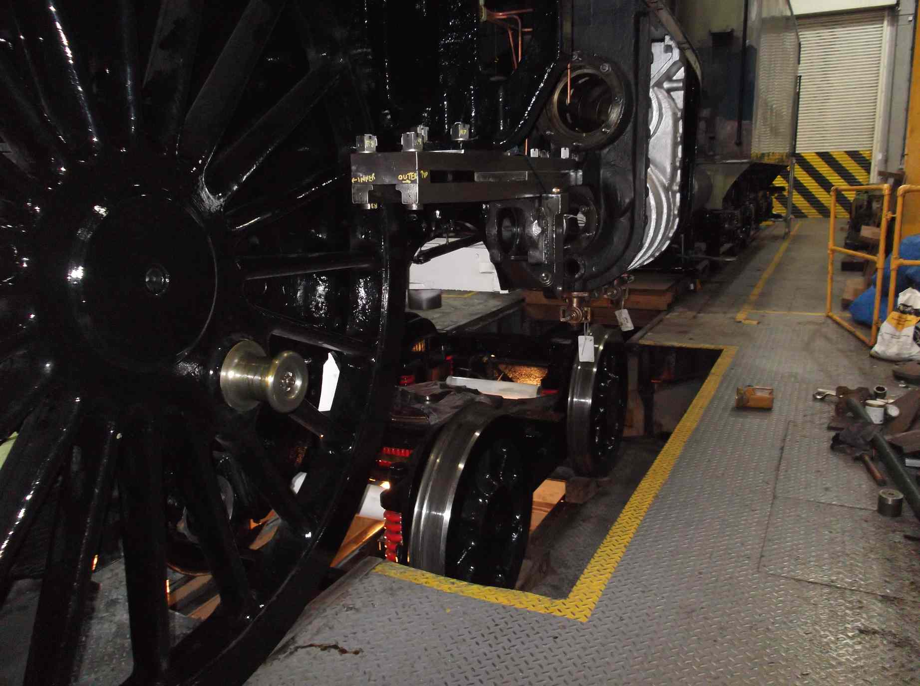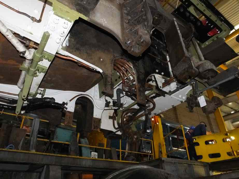 The Cartazzi wheelset has now been removed from the frames. There was just enough room in the workshop to move the tender forward and get the Cartazzi on to the wheeldrop. A couple of pipes had to be removed, not greeted enthusiastically by the pipe fitting team. It was all a relatively straight forward operation by a well-practised team.
