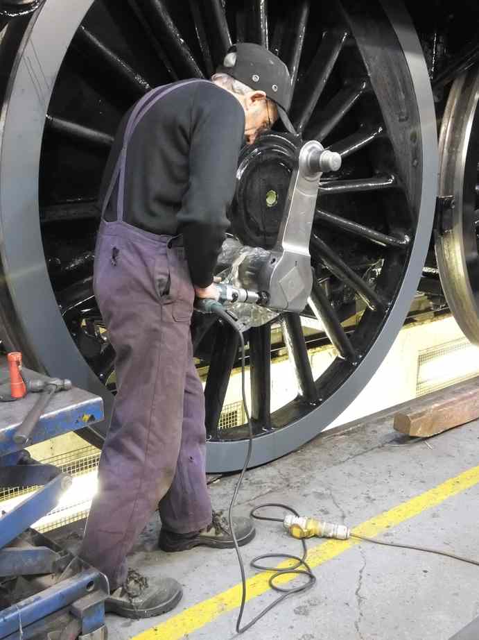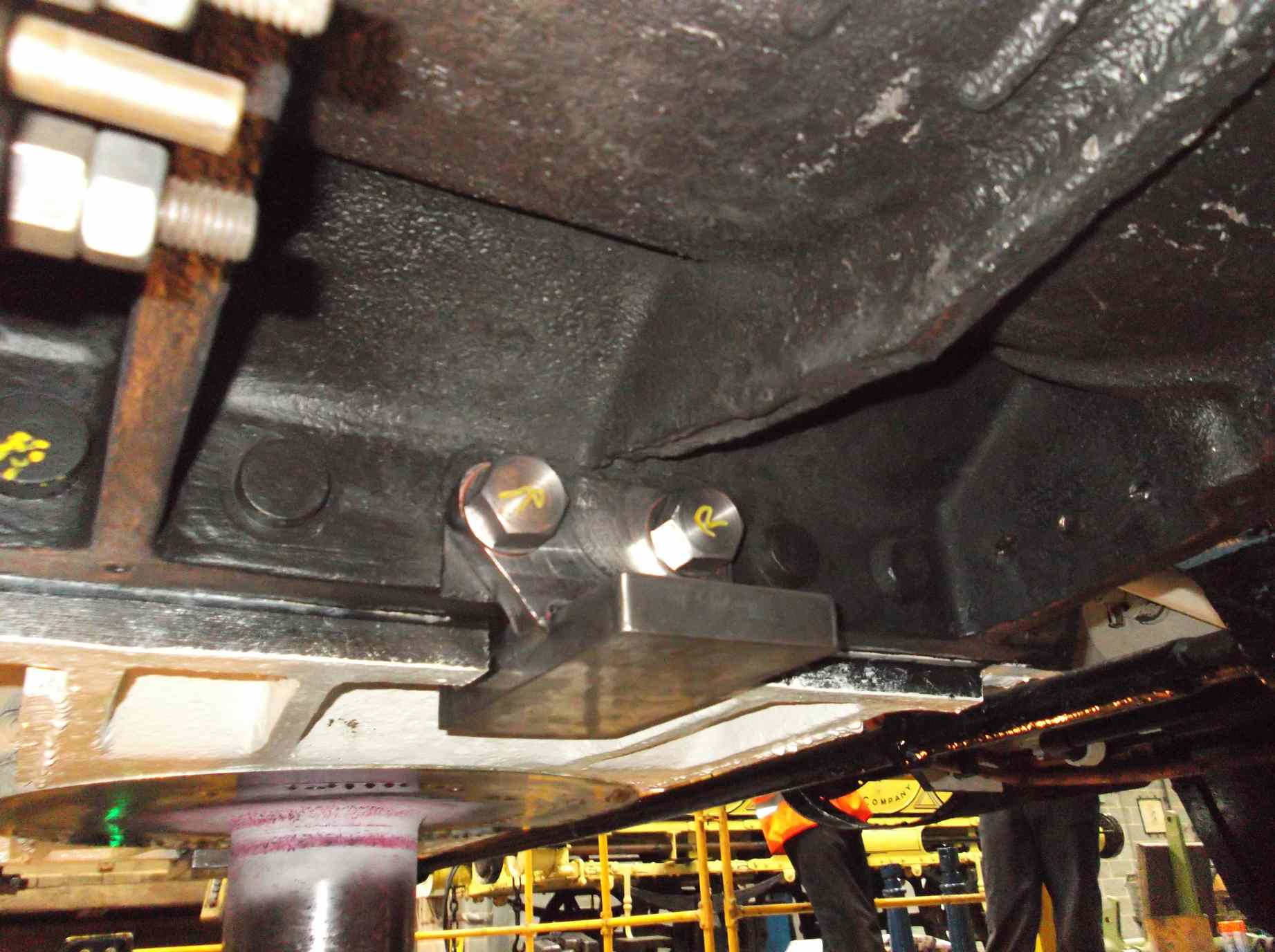 While on the wheeldrop the loco centre bogie pivot spigot was di-pen inspected to complete our photo record of the inspection of the loco bogie stretcher. The bogie was then raised back under the loco and the side-bearer gaps either side are satisfactory and even. With the bogie back in place the bogie pivot bolt was fitted and the nut fitted and pinned.