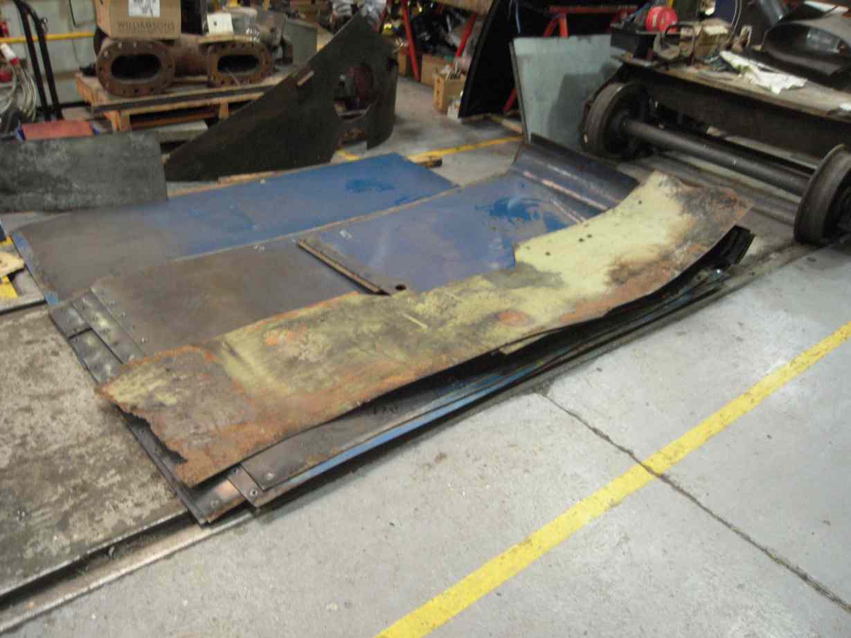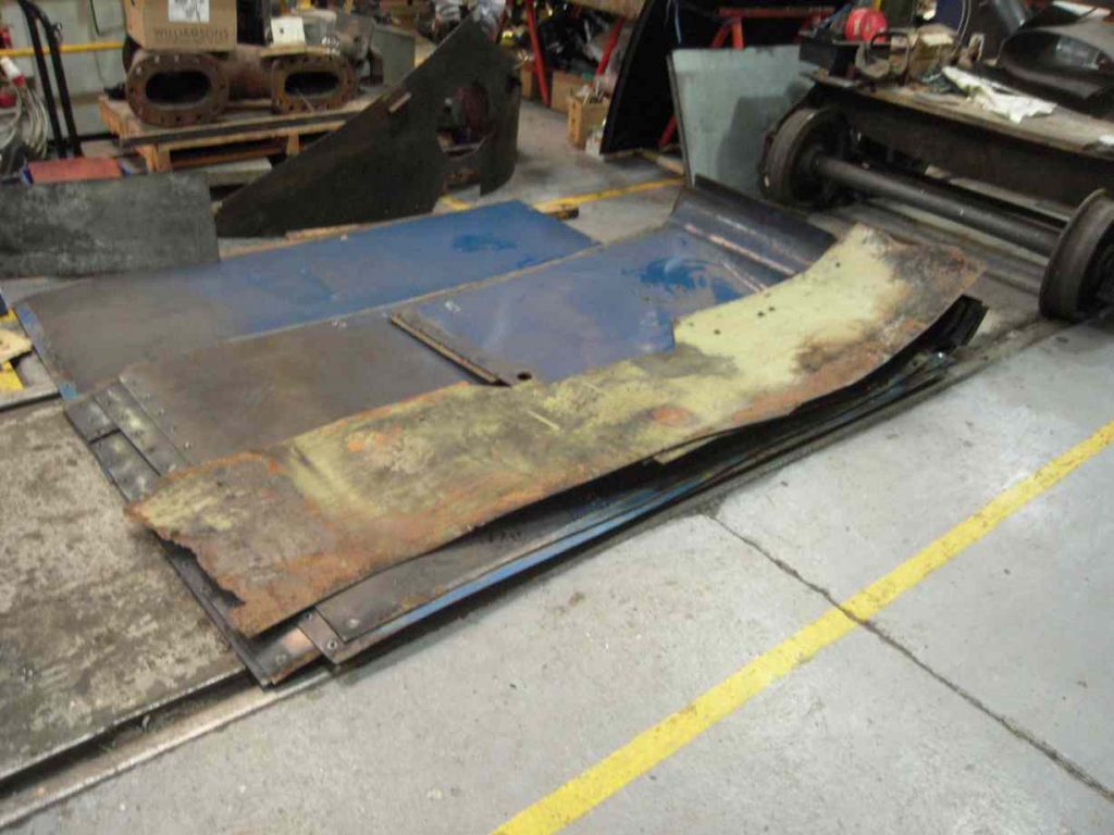 Meanwhile work has progressed on the main cladding panels. They have all been cleaned and given a coat of primer. The panels were assessed for condition and sections marked up that are wasted and require cutting out and replacement. New steel has been obtained, as a flat sheet and a piece rolled to the radius of the lower roll in the cladding where it meets the footplate. To explore the practicality of repairing the panels, one was repaired with a new flat section where it had wasted to lace along it’s edge where under a cladding band, and along the edge where on the footplate. Putting in sections will change the stiffness in that area and it is to be seen if the panel will roll correctly when fitted to the loco.