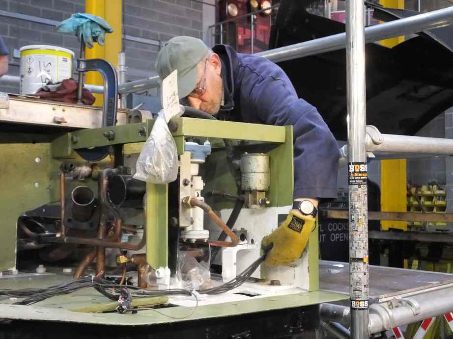 Elsewhere most of the Pipe Fitting Team’s efforts have been directed at the installation of the new pipe runs on the top of the tender. The right hand water filler flange has had to be moved to the rear to allow the large air supply pipe to come up the same drain duct as the water filler pipe. The air supply pipe comes from the air pump to the reservoir tanks on the tender top. To make the arrangement as compact as possible, flanges were altered from standard and welded on to the pipework, removing the need for additional fittings. The air tanks have also trial fitted to ensure no pipe run clashes.