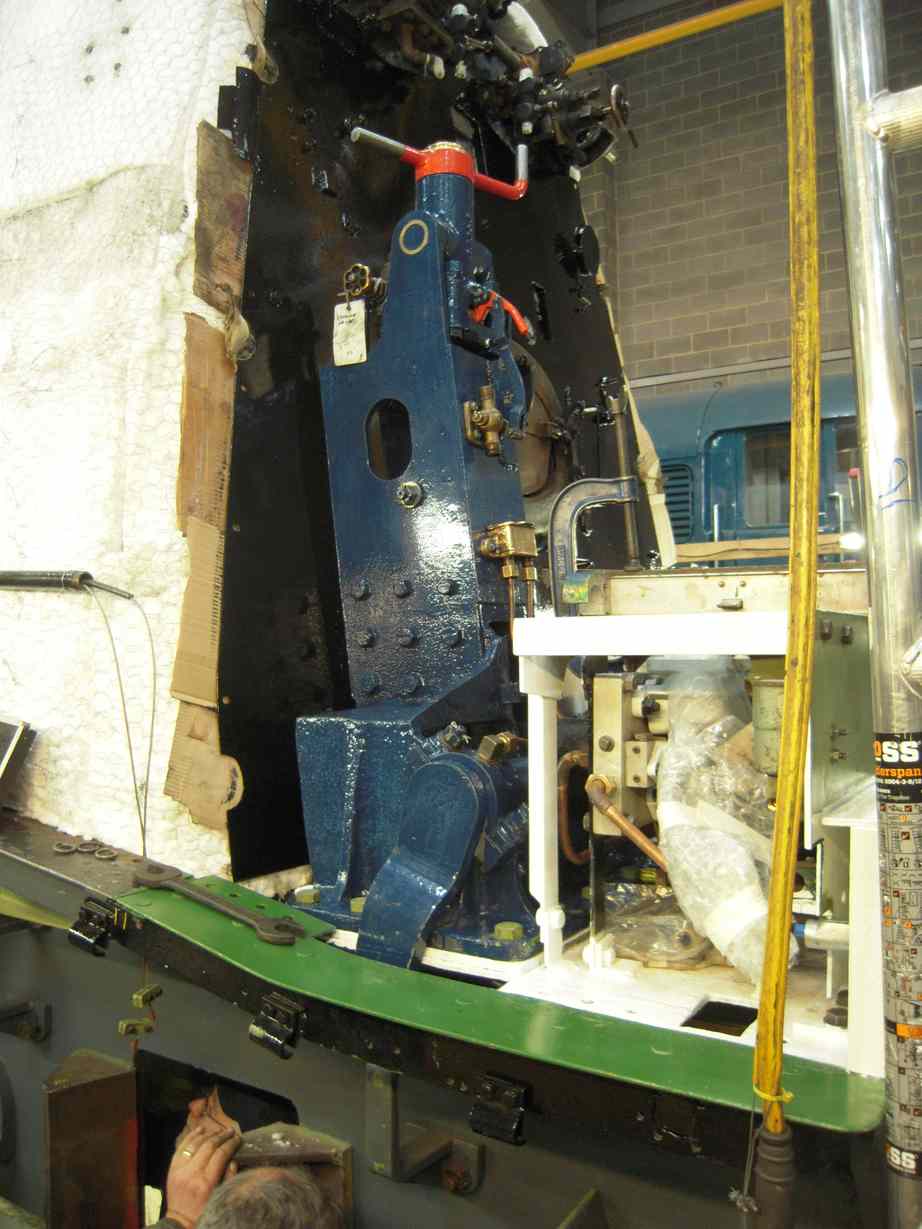 When the belly sheets were in they were pop-riveted along the bottom seam and the outer bands secured to the crinolines at the top and pulled together with long threaded studs on the bottom. The cladding around the throat plate presents quite a challenge because of the shape of the boiler and the difficult access due to the location of the air pump. Further work is required here. It was found that the securing of the cladding would be aided by the addition of a further band not originally fitted here. So new material was obtained and a new belly band fabricated and fitted. This has all been a long tough job carried out by our volunteers.