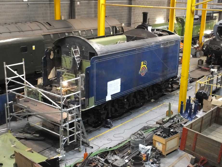 The small canopy at the end of the corridor has been fitted. Where it meets the tender side, the top tender streamlining and the tender front plate have also to be finished. It’s quite a complicated coming together. I don’t think the boiler-making team are going to enjoy work where they can’t swing a big hammer or get max-amps on the job.