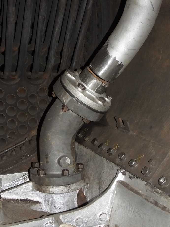 As the cast iron pipes are new, the existing steel pipes don’t quite meet the cast irons ones so the steel pipes require modification. This is done by cutting the steel pipes and fastening their ends at the superheater and on the cast iron pipes. The gaps are then bridged with steel pieces to hold the pipe to its new shape. The pipes will then be sent to contractors for welding and, where necessary, new sections of pipe will have to be added. This is difficult and heavy work.