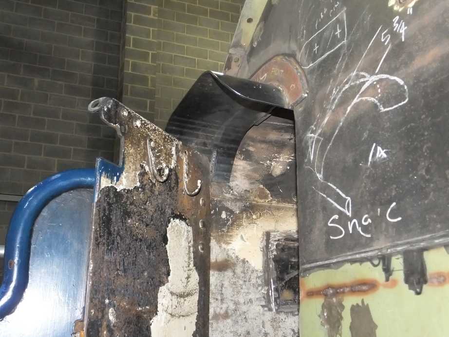 Considering the amount of time that the right leading panel has consumed and how much more work is needed on the left panels, it was decided that a new approach was required. We decided to replace the entire right leading panel. The material was specified and a flat sheet and a rolled section were collected from Teesside by an engineering team volunteer. A couple of days’ work later, we put up a new panel with full material thickness and no patches. In fact it looks a lot better than its ex-service neighbour. So we are capable, and have a time and cost-effective method to proceed with recladding the boiler, where it needs it. The panels are awkward things to handle and we are so lucky to have the overhead crane.