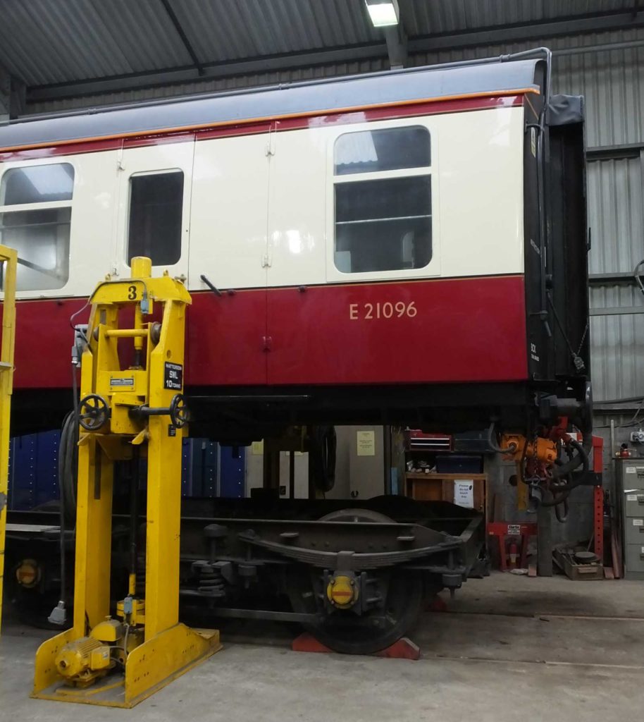 A week after the coach survey we again visited the coach to see it lifted and this allowed a thorough survey of the bogies and the bogie castings on the bottom of the coach. Things didn’t look half bad. There are a few jobs to attend to but these are mainly normal maintenance jobs like re-shimming horns and checking pins for wear. With the weight off the bogie the springs look very good with the leaves remaining tight together. The coach has now been put back on its bogies and moved outside while the contractors await our instructions to proceed to the next stage of the overhaul.