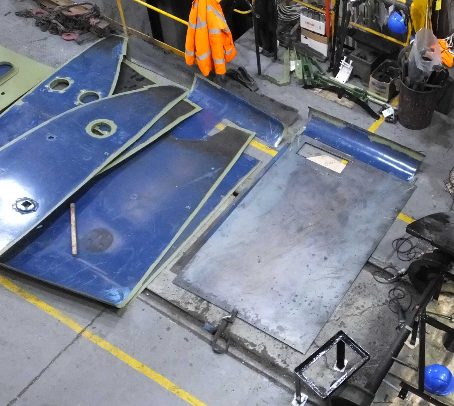 Progress has been made with the boiler cladding. The right leading boiler panel has been previously weld repaired and was kind of OK, but would need further cosmetic and fitting work. However, the left side panels are in worse condition, perhaps due to being on the east side of the loco on the NYMR. So the left panels will require even more work.