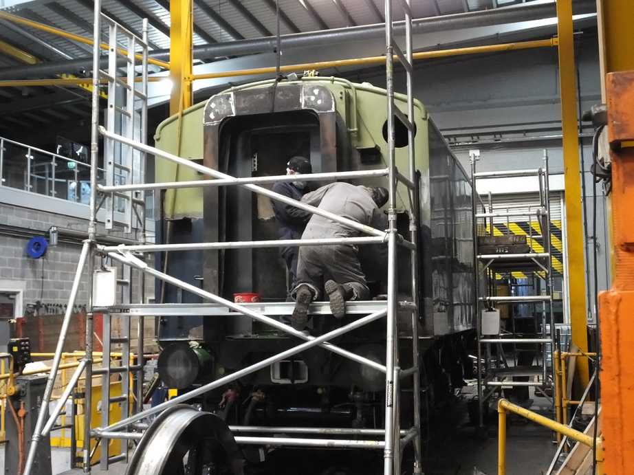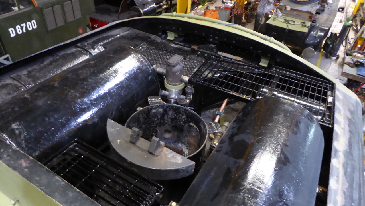At the back of the tender, and on the upper sides, prepping for painting is underway.