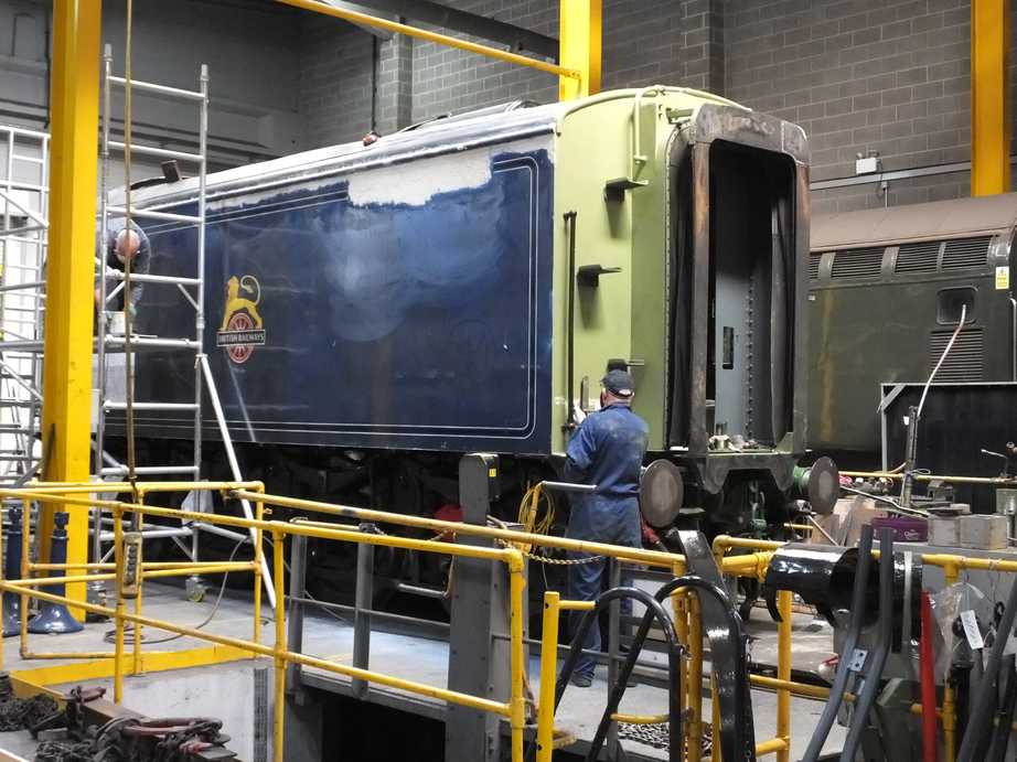 The final patches of paint around the vestibule have been needle gunned off. Filler has been applied along the top of the upper beading, at the back of the tender and along the new streamlining where welded to the tender side. Primer is being applied.