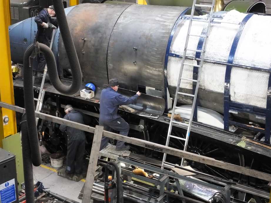 On the left the leading boiler barrel and next trailing cladding panels are now fabricated and temporarily mounted on the engine and have been marked for locating the cutouts for their access doors. They will be removed, door apertures cut out, painted then refitted for the final time. It is not planned to replace any other full panels but other panels still require repair.