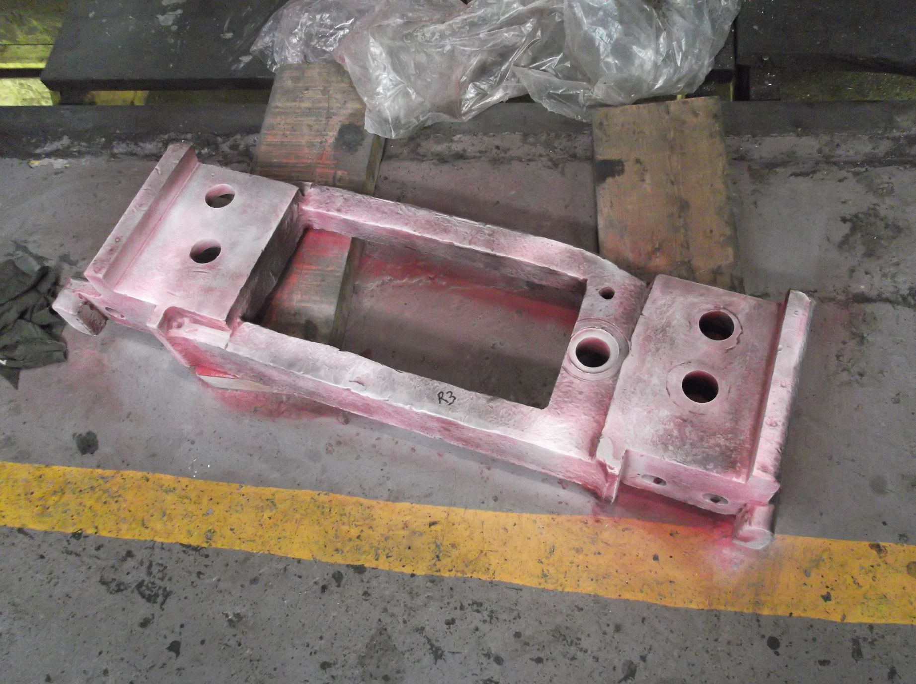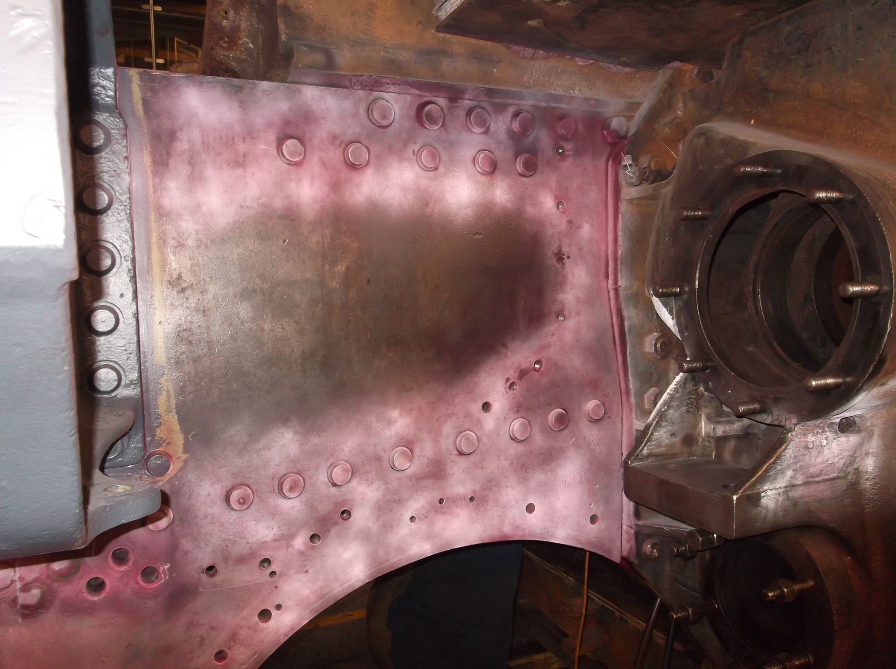 The frame plate to the rear of the left-hand cylinder casting, which was hidden behind the left-hand leading sandbox, was “di-penned” this week. After detailed inspection is was declared defect-free and was then primed. The outside of the mainframes up to the cylinder castings has now been primed. Further areas subject to flaw detection this week included the brake hanger brackets. These were given a final clean and the test fluids applied. No faults were found.
