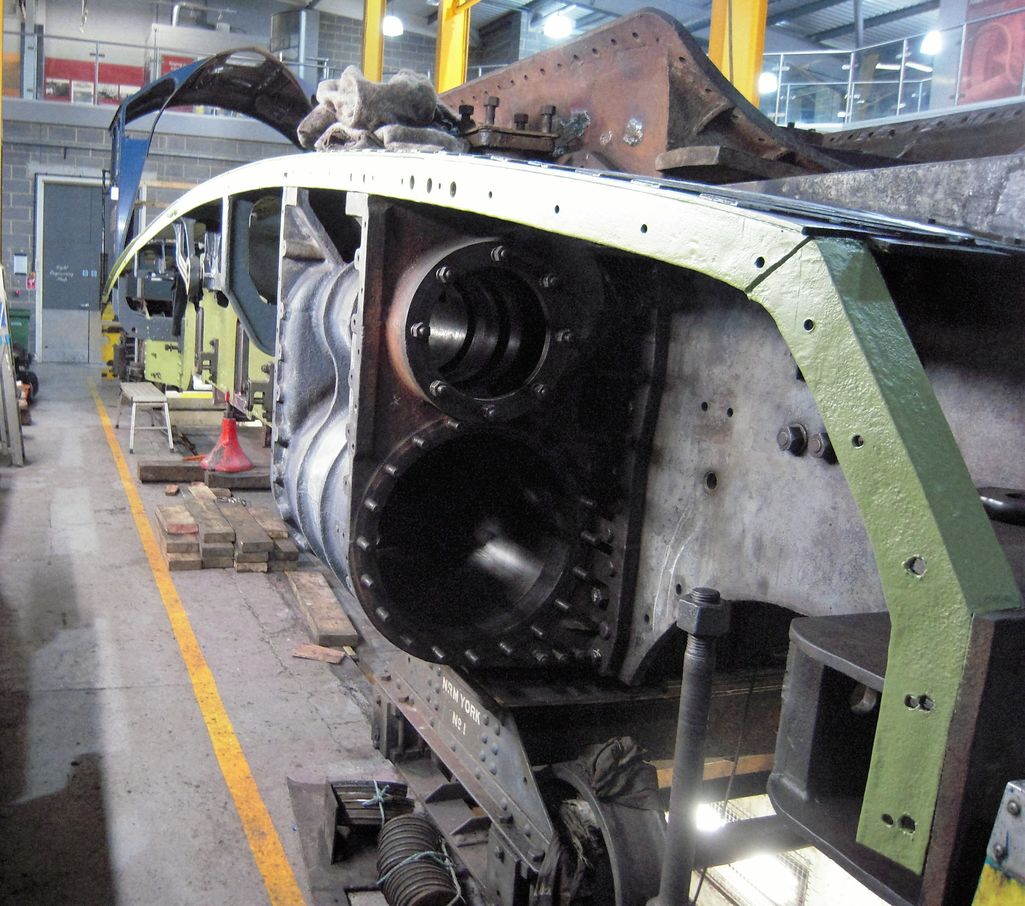 At York, work continued with the removal of the middle cylinder studs. There are only two studs remaining that will require cutting off before they can be drilled out. A guard has been made to go round the studs to make sure the face of the cylinder casting is protected when the studs are cut. Also competing for space near the middle cylinder, work continues on preparing the steam chests for final inspection and the fitting of new valve liners.