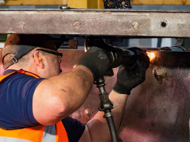 While priming continues on the footplating we have been removing the remaining loose rivets and welding up bolts in the footplating on the left-hand side. Loose rivets and bolts left in place wear their holes and countersinks meaning when they are removed the holes need work to repair them before we can fit new fasteners. Some have been re-drilled and worn so much over the years that they require welding up and remaking. Some of the holes were welded on Saturday.