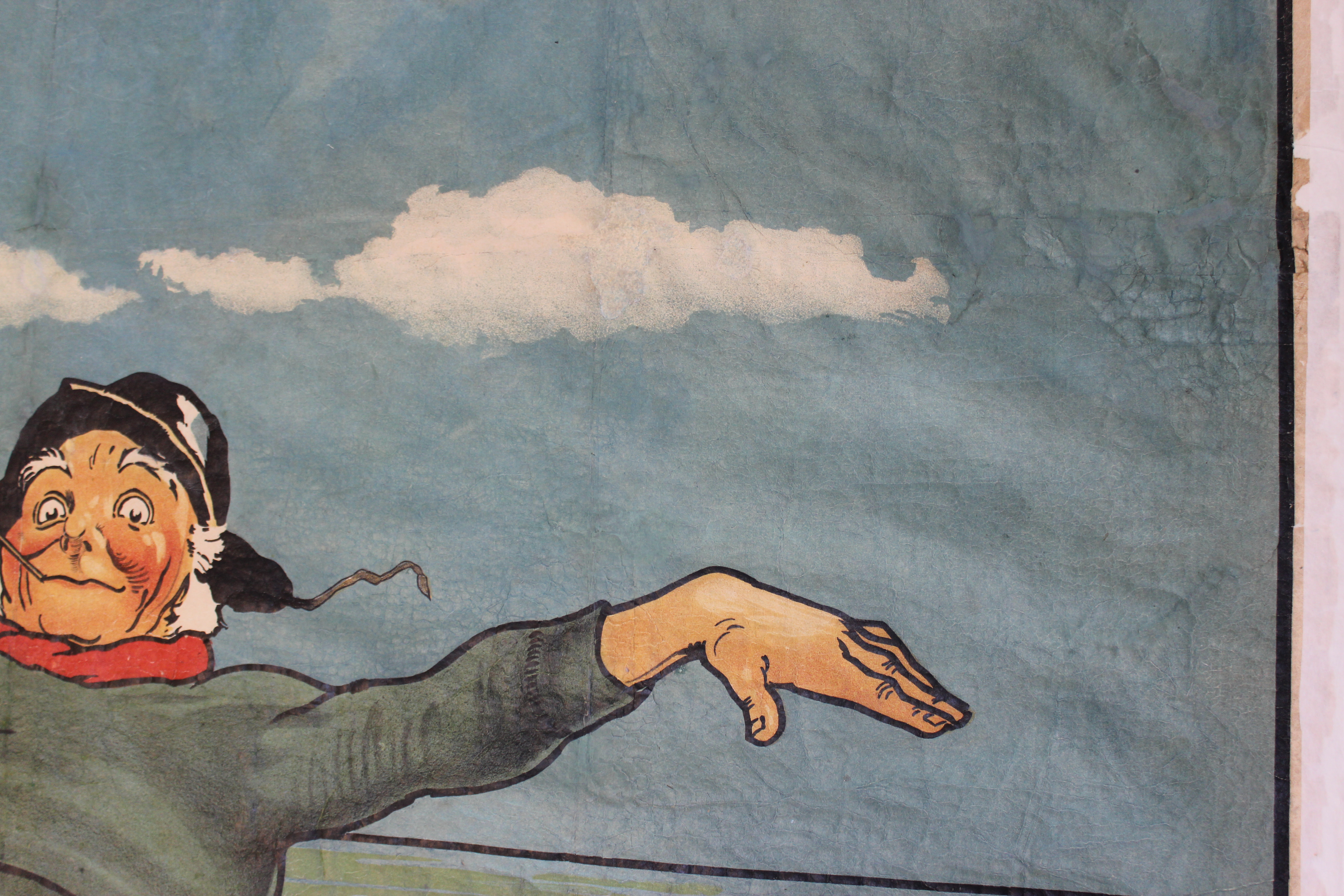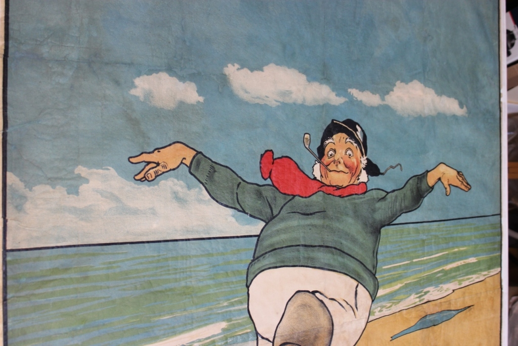 We have one of the originals, which is a large 2.8m by 1.4m. It had been rolled in store since its purchase in 1992 and was in poor condition. It had become very brittle with age and received some unsatisfactory restoration before being acquired by the museum, so it wasn’t in suitable condition to be shown. When we decided we wanted to display the poster in the Hints for Holidays exhibition, we contacted local conservator Ruth Mathias to see if she could help.