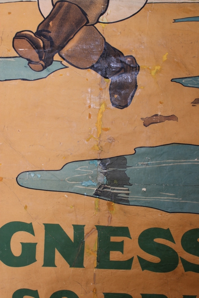 The poster had been backed onto linen and ideally Ruth wanted to remove this. But initial investigations showed that this wouldn’t be possible due to the type of adhesive that had been used and the fragility of the paper from which the poster itself is made.