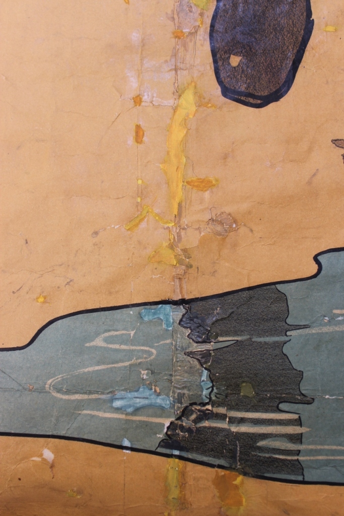 Ruth examined the poster and found that the acid in the paper had caused it to become brittle, and that some of the surface was starting to flake away (this is called delamination). The old repairs needed removing and new ones adding in with correctly toned paper to disguise the repairs.