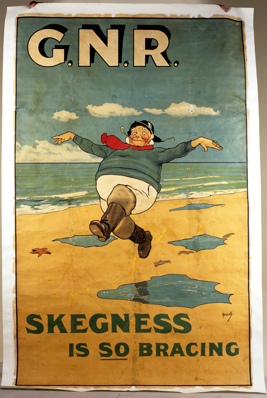 John Hassall’s ‘Skegness is SO Bracing’ is one of the most iconic British railway posters and has been a popular image since its first publication by the Great Northern Railway in 1908. It has been repeatedly reproduced, reworked and parodied, and the Jolly Fisherman, featured in the poster, has become an icon of his hometown, Skegness.