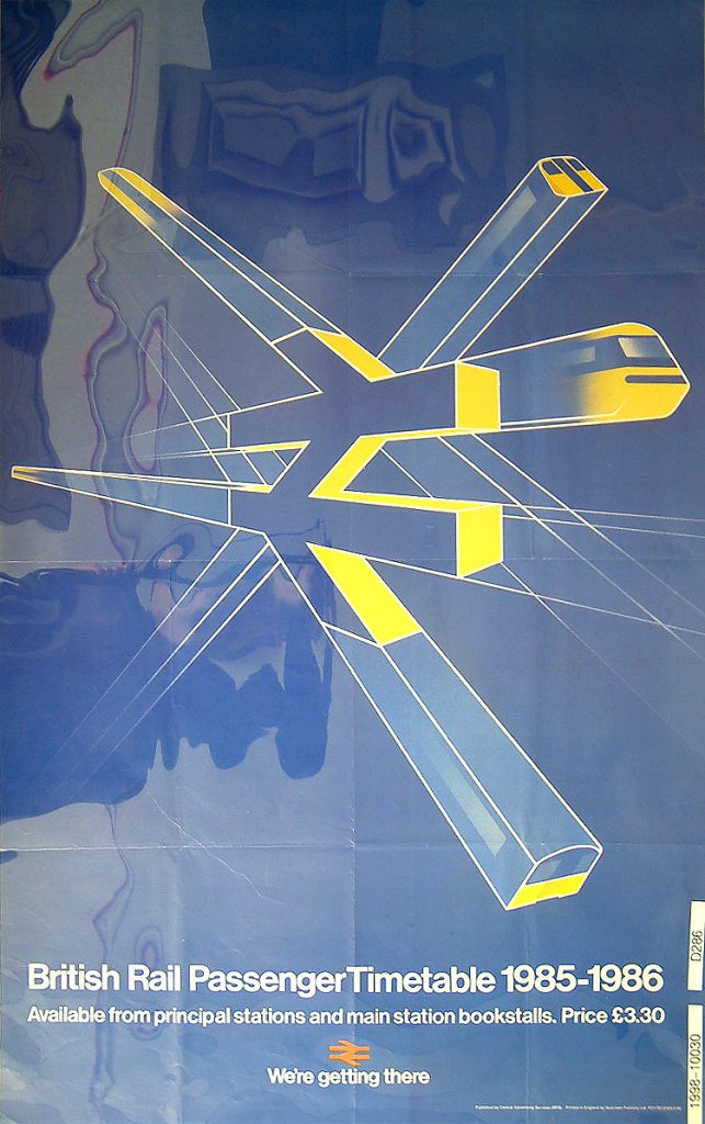 At a price of 50p (The equivalent of £10 now) it’s 1,350 pages provided times for the entire year. In 1986, BR started to issue the timetable twice a year, with summer and winter editions. At this time, it was something that BR wanted to publicise—even promoting its availability using posters like this striking example of graphic design based on the BR double arrow symbol.