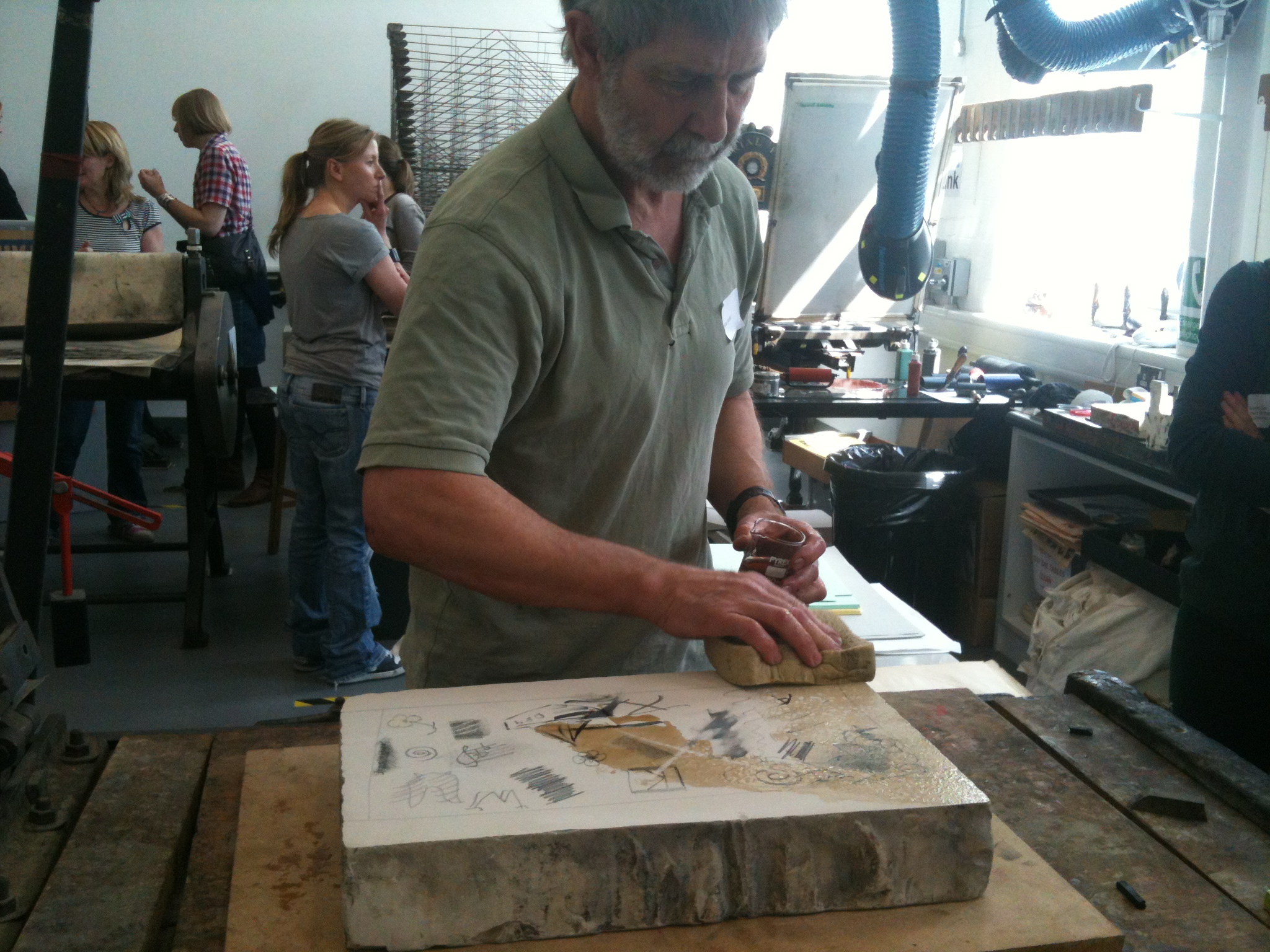 The basic lithographic process involves making marks with a greasy crayon or ink on a piece of limestone that has been ground down and made smooth. The limestone is absorbent and absorbs the grease. The surface of the stone is then chemically treated to bind the grease to the stone, damped with water and finally inked using a greasy printing ink. The ink sticks to the greasy marks but is repelled by the water, allowing the design to be printed.