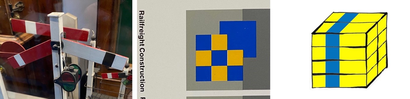 Things I particularly like and want to include in Play Revolution include the black and yellow stripes of warning lines and freight train liveries; the chequers of warning signs and flood level measures; the shapes of sections of beams and embankments, railway signals and lights; bridge design details such as arches and fretwork.