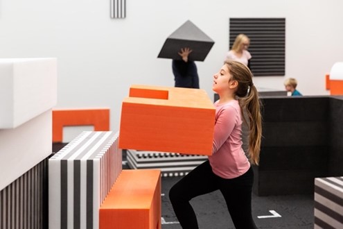 Play Rebellion was a temporary exhibition that comprised 1m cubes that break down into different shapes that can be reconfigured by visitors. It was inspired by endless hours spent in soft play centres and outdoor playgrounds with my kids and the frustration we all felt at the static, fixed, primary-coloured equipment that allowed limited play opportunities. Play Rebellion aimed to open up opportunities for kids (and adults) to create their own playful environments with sophisticated shapes and colours that allowed them to experiment with form and colour, test their physical and mental agility, manage their own risk and meet new people.