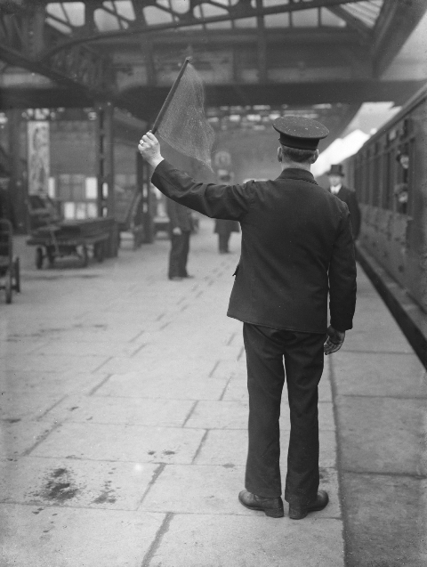 The example we have collected bears the iconic British Rail ‘double arrow’ logo, usefully dating it to 1997 at latest. I’ve included some images (above and below) of railway workers from the 1920s and 1964 giving trains the ‘Right away!’, using hand signals and flags. Whatever the method used, they highlight the importance of the human element in ensuring the safety of rail passengers and the trains running on time.