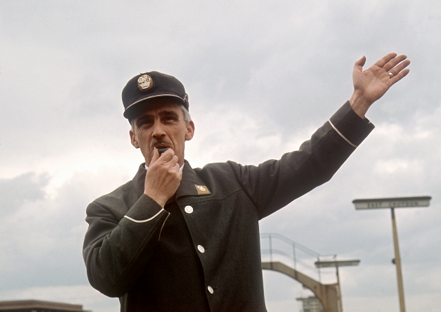 It’s worth emphasising that the whistle is not the signal – instead it draws attention to the signal, which is either the baton, the flag, or the raised hand(s). The signal can also be to stop the train rather than to start it – this can happen if the Guard or platform staff spot something wrong after the train has been started. The stop signal would be a red flag or lamp, *both* arms raised, or an object (possibly the baton) or lamp waved vigorously. On trains with internal communication bells or buzzers, two beats is to start, one beat to stop.