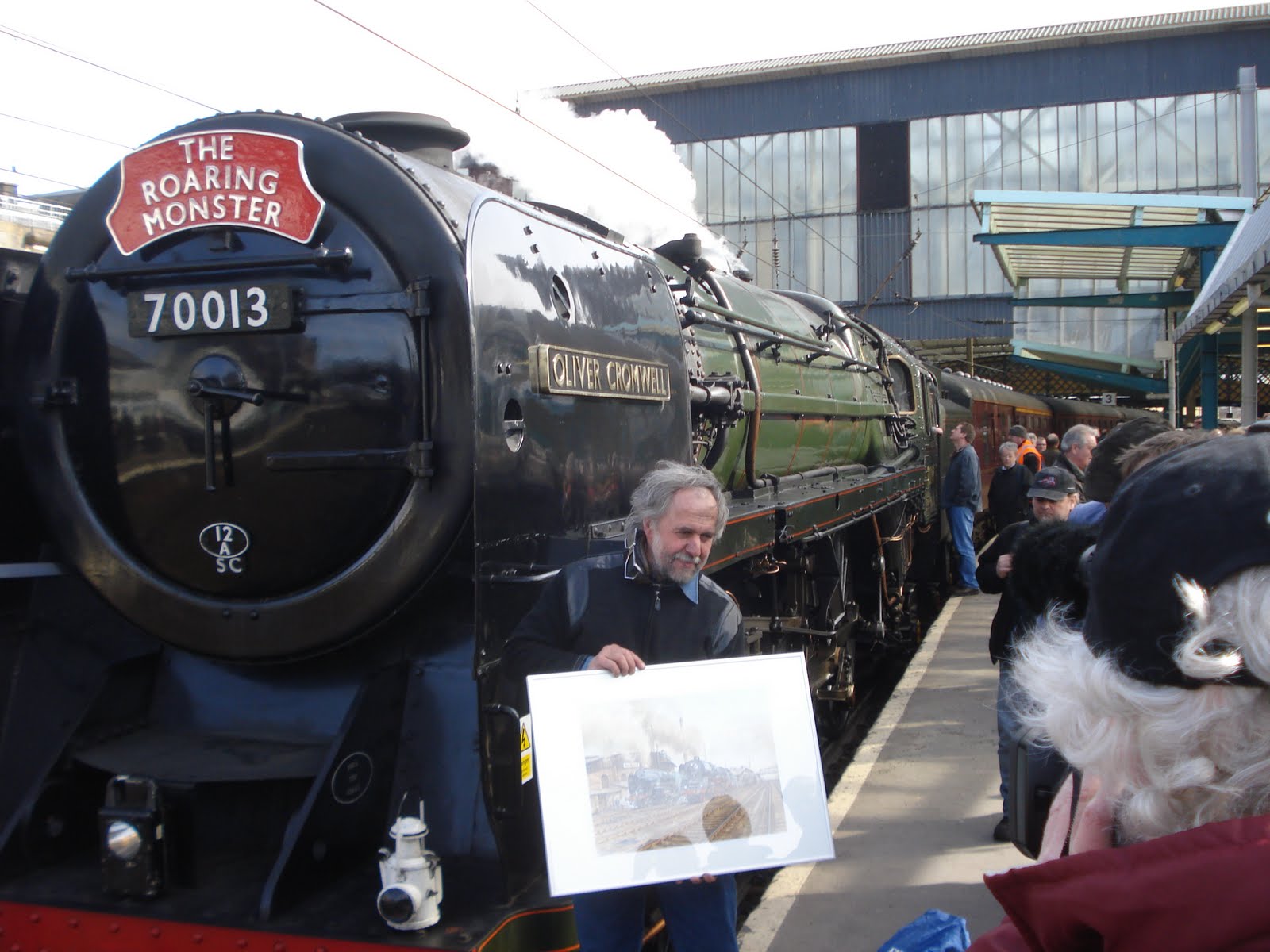 Well, what can I say about the trip up Shap? No doubt it will be minutely pored over and written up in due course, but we looked to have a fantastic ascent, as we blasted through Oxenholme with an eye watering blockade of sound from the engine, but sadly the brakes soon came on for a temporary speed restriction at Tebay. This is all there was, taking speed down to 20mph, but the crew did their best, getting 70013 back up to 55mph before the climb settled in. We went over the top at 21mph, not bad for having accelerated from the TSR with 12 coaches and no diesel in tow. Applause broke out in the support coach as we crested the summit, and there is some very fine film on Youtube of it all. Belwo on arrival at Carlisle, German enthusiast and artist Peter Bomhard poses with his painting of 70013 and 03 1010 at Halle. Prints of this will soon be available to help support 03 1010. Look at www.eisenbahn-bilder.de for more of Peter’s fine work.