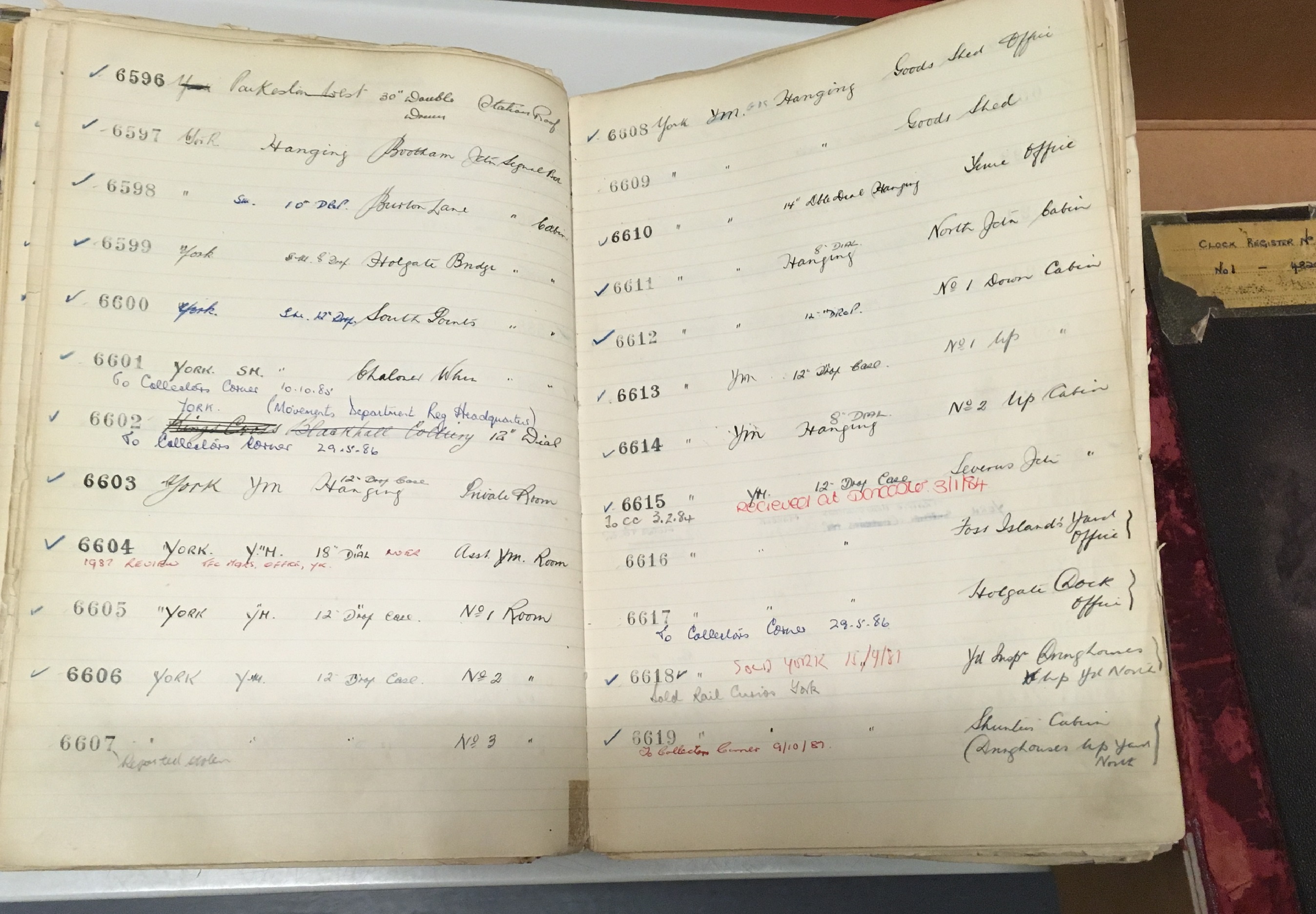Above is a page from of one of the clock registers for the London & North Eastern Railway (LNER) and its successor regions under British Railways—the Eastern & North Eastern regions. The LNER inherited clocks from many different companies after the railway grouping in 1923, and like just like their locomotives found that they now had multiple locomotives with the same number. So just like they did with the locomotives, they instigated a re-numbering scheme for clocks, and the registers we hold reflect that re-numbering, they don’t have any details of clock numbers prior to the LNER scheme, so if you have a clock with a pre-grouping number it isn’t going to be of help. The LNER registers just record the number, the specific location of the clock, the dial size and other details, and later notes often provide details such as a clock being sold or condemned or in a few cases even stolen.